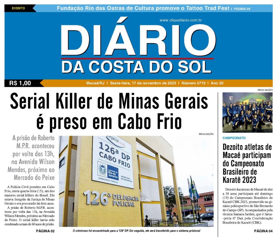 Edições Impressas Edição de sexta-feira 17/11/2023 nº 5719 Publicado em 17/11/2023 - 07:00 Escrito por Redação Notícias relacionadas: Seguinte Edição de sábado a terça-feira 18 a 21/11/2023 nº 5720 Anterior Edição de quarta e quinta-feira 15 e 16/11/2023 nº 5718 Redação Notícias Recentes Saúde11 horas atrás Rio das Ostras ultrapassa marca dos 13,5 mil pets vacinados em campanha contra a raiva Cidades11 horas atrás Procon apreende bebidas em depósito no bairro São José do Barreto, em Macaé Araruama11 horas atrás Prefeitura de Araruama apresenta detalhes da Expo 2025 e reforça operação de segurança e trânsito Arraial do cabo11 horas atrás Secretaria de Mobilidade Urbana de Arraial participa de congresso nacional em São Paulo Polícia12 horas atrás Polícia Militar recupera Fiat Toro abndonado às margens da Linha Azul, em Macaé Arraial do cabo12 horas atrás Conselho Municipal de Arraial promove encontro sobre políticas de proteção animal Cabo Frio12 horas atrás Cabo Frio amplia medidas de preservação com novas placas e plantio de espécies nativas Cidades12 horas atrás Carapebus conclui curso técnico para agentes de saúde e de endemias Comércio12 horas atrás Plaza Rio das Ostras ganha 7 novas lojas em outubro e já prepara mais uma inauguração Educação13 horas atrás Saquarema atualiza situação de obras de nova creche no bairro Palmital Clique Diário E. L. Mídia Editora Ltda CNPJ: 09.298.880/0001-07 Redação: Rua Tupinambás 122 Gloria – Macaé/RJ comercial@diariocs.com (22) 2765-7353 (22) 999253130 Mais lidas da semana Edições Impressas6 dias atrás Edição de sábado a segunda-feira 25 a 27/10/2025 nº 6198 Cultura2 dias atrás Prédio da Onda, em Rio das Ostras, recebe oficina teatral gratuita a partir dessa quinta, 30 Cultura7 dias atrás Teatro de Rio das Ostras tem fim de semana com 2 espetáculos locais Edições Impressas7 dias atrás Edição de sexta-feira 24/10/2025 nº 6197