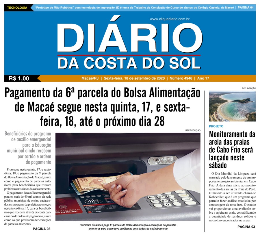 Edições Impressas Edição de sexta-feira 18/09/2020 nº 4946 Publicado em 18/09/2020 - 05:00 Escrito por Fernando Vitor Notícias relacionadas:destaque Seguinte Edição de Sáb a Seg 19 a 21/09/2020 nº 4947 Anterior Edição de quinta-feira 17/09/2020 nº 4945 Fernando Vitor Notícias Recentes Cabo Frio7 horas atrás Arte e solidariedade marcam a 1ª Mostra de Dança Regional de Tamoios Cidades12 horas atrás Região serrana de Macaé recebe 1º X-Force Passeio de Quadriciclo e Aranha neste domingo (26) Polícia12 horas atrás Polícia apreende mais de meio quilo de drogas no Loteamento São João, em Rio das Ostras Saúde1 dia atrás Eventos esportivo e cultural reforça campanha do Outubro Rosa em Rio das Ostras nesse domingo, 26 Edições Impressas1 dia atrás Sábado a segunda-feira 25 a 27/10/2025 nº 6197 Cidades2 dias atrás Shopping Plaza Macaé oferece programação gratuita com feira de adoção e show de pagode neste fim de semana Cidades2 dias atrás 32º BPM completa 23 anos com solenidade de celebração e reconhecimento aos policiais Armação dos Búzios2 dias atrás Búzios celebra esporte e superação com XC RUN 2025 Araruama2 dias atrás Araruama promove saúde, lazer e cidadania em evento comunitário Arraial do cabo2 dias atrás Educação e sustentabilidade se encontram para jovens de Arraial do Cabo Clique Diário E. L. Mídia Editora Ltda CNPJ: 09.298.880/0001-07 Redação: Rua Tupinambás 122 Gloria – Macaé/RJ comercial@diariocs.com (22) 2765-7353 (22) 999253130 Mais lidas da semana Cultura6 dias atrás Silva Jardim anuncia shows gratuitos de samba e pagode para o fim de semana Cultura5 dias atrás Música, emoção e cores: Rodrigo Pontes apresenta show especial em Rio das Ostras Cabo Frio6 dias atrás Atletas de várias cidades se enfrentam em competição de Muay Thai em Cabo Frio Cabo Frio6 dias atrás Serviços essenciais permanecem ativos durante ponto facultativo em Cabo Frio