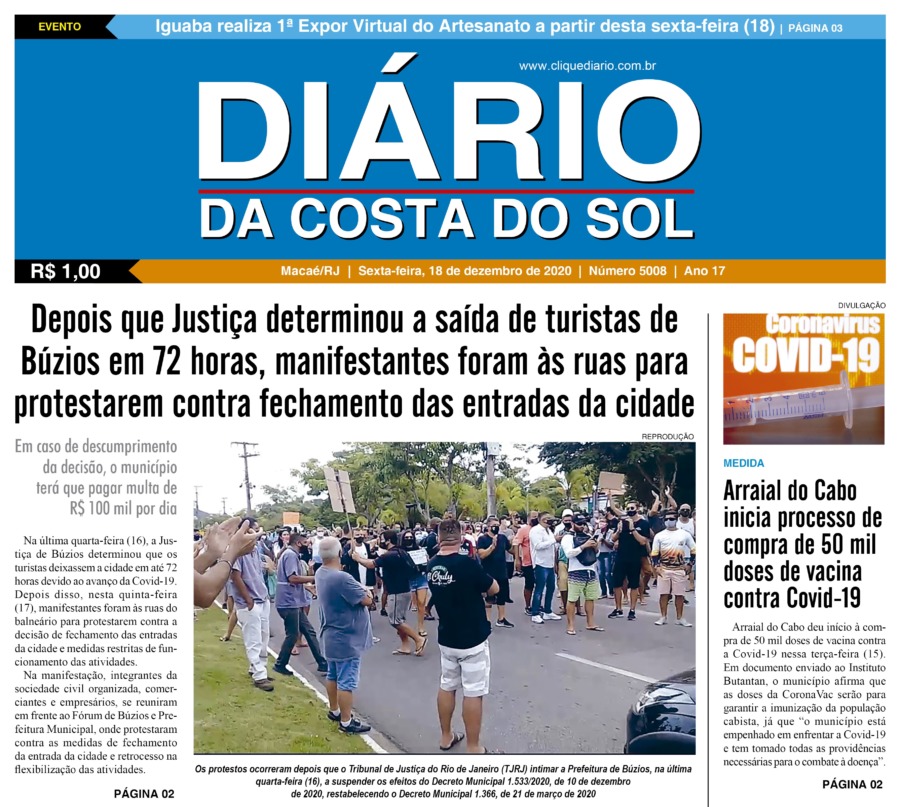 Edições Impressas Edição de sexta-feira 18/12/2020 nº 5008 Publicado em 18/12/2020 - 01:28 Escrito por Fernando Vitor Notícias relacionadas:destaque Seguinte Edição de sábado a segunda-feira 19 a 21/12/2020 nº 5009 Anterior Edição de quinta-feira 17/12/2020 nº 5007 Fernando Vitor Notícias Recentes Cabo Frio2 dias atrás Estudantes de Cabo Frio brilham em premiação do projeto CaptaAção Meio Ambiente2 dias atrás Cepro promove encontro para discutir avanços e desafios da justiça climática em Rio das Ostras Armação dos Búzios2 dias atrás Búzios Swim celebra esporte, natureza e turismo na Região dos Lagos Cabo Frio2 dias atrás Educação pública de Cabo Frio colhe frutos com conquistas em competições científicas Edições Impressas2 dias atrás Edição de sábado a segunda-feira 08 a 10/11/2025 nº 6208 Polícia2 dias atrás Moto sem placa é abandonada após fuga de suspeito em Macaé Polícia2 dias atrás Polícia Civil prende homem em flagrante por tráfico de drogas no Parque Aeroporto, em Macaé Iguaba2 dias atrás Menina de Iguaba Grande realiza sonho e conhece o príncipe William no Rio de Janeiro Arraial do cabo2 dias atrás Arraial do Cabo é exemplo de tranquilidade na Região dos Lagos, segundo dados do ISP Arraial do cabo2 dias atrás Festival em Arraial do Cabo promete recorde de público com mais de 15 mil pratos e 10 mil litros de chope Clique Diário E. L. Mídia Editora Ltda CNPJ: 09.298.880/0001-07 Redação: Rua Tupinambás 122 Gloria – Macaé/RJ comercial@diariocs.com (22) 2765-7353 (22) 999253130 Mais lidas da semana Arraial do cabo4 dias atrás Arraial do Cabo celebra 3ª edição do Festival de Frutos do Mar com entrada livre; Carol Biazin, Ramona Rox, Liah Soares e mais Meio Ambiente5 dias atrás Programa do governo estadual promove limpeza de rio no Âncora, em Rio das Ostras Meio Ambiente4 dias atrás Ações do Programa Limpa Rio seguem em vários pontos de Rio das Ostras Cidades6 dias atrás HFM ganha novo Pronto-Socorro moderno e ampliado em Campos