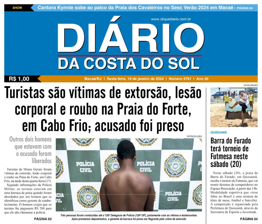 Edições Impressas Edição de sexta-feira 19/01/2024 nº 5761 Publicado em 19/01/2024 - 00:00 Escrito por Redação Notícias relacionadas: Seguinte Edição de sábado a segunda-feira 20 a 22/01/2024 nº 5762 Anterior Edição de quinta-feira 18/01/2024 nº 5760 Redação Notícias Recentes Cabo Frio16 horas atrás Arte e solidariedade marcam a 1ª Mostra de Dança Regional de Tamoios Cidades21 horas atrás Região serrana de Macaé recebe 1º X-Force Passeio de Quadriciclo e Aranha neste domingo (26) Polícia21 horas atrás Polícia apreende mais de meio quilo de drogas no Loteamento São João, em Rio das Ostras Saúde2 dias atrás Eventos esportivo e cultural reforça campanha do Outubro Rosa em Rio das Ostras nesse domingo, 26 Edições Impressas2 dias atrás Sábado a segunda-feira 25 a 27/10/2025 nº 6197 Cidades2 dias atrás Shopping Plaza Macaé oferece programação gratuita com feira de adoção e show de pagode neste fim de semana Cidades3 dias atrás 32º BPM completa 23 anos com solenidade de celebração e reconhecimento aos policiais Armação dos Búzios3 dias atrás Búzios celebra esporte e superação com XC RUN 2025 Araruama3 dias atrás Araruama promove saúde, lazer e cidadania em evento comunitário Arraial do cabo3 dias atrás Educação e sustentabilidade se encontram para jovens de Arraial do Cabo Clique Diário E. L. Mídia Editora Ltda CNPJ: 09.298.880/0001-07 Redação: Rua Tupinambás 122 Gloria – Macaé/RJ comercial@diariocs.com (22) 2765-7353 (22) 999253130 Mais lidas da semana Cultura7 dias atrás Silva Jardim anuncia shows gratuitos de samba e pagode para o fim de semana Cultura6 dias atrás Música, emoção e cores: Rodrigo Pontes apresenta show especial em Rio das Ostras Cabo Frio7 dias atrás Atletas de várias cidades se enfrentam em competição de Muay Thai em Cabo Frio Cabo Frio7 dias atrás Serviços essenciais permanecem ativos durante ponto facultativo em Cabo Frio