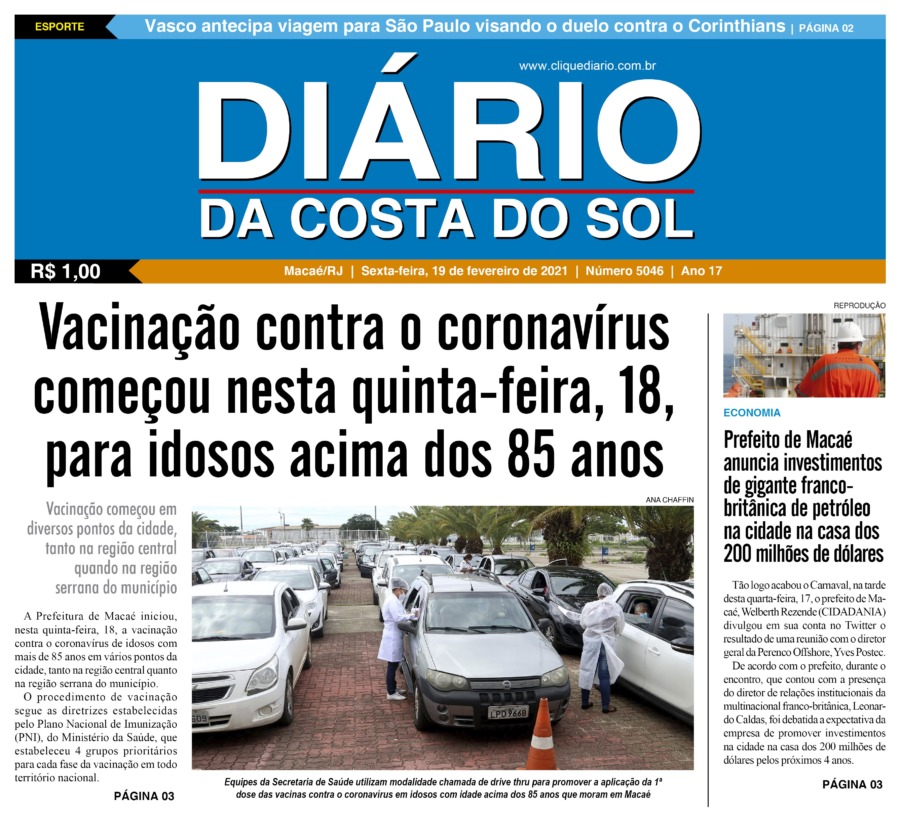 Edições Impressas Edição de sexta-feira 19/02/2021 nº 5046 Publicado em 19/02/2021 - 02:31 Escrito por Fernando Vitor Notícias relacionadas:destaque Seguinte Edição de sábado a segunda-feira 20 a 22/02/2021 nº 5047 Anterior Edição de sábado a quinta-feira 13 a 18/02/2021 nº 5045 Fernando Vitor Notícias Recentes Polícia27 minutos atrás Farmácia é interditada e uma pessoa é presa em Rio das Ostras em operação da Polícia Federal Polícia1 hora atrás Homem é preso nessa madrugada na Cidade Praiana, em Rio das Ostras Edições Impressas1 hora atrás Edição de quarta-feira 12/11/2025 nº 6210 Arraial do cabo17 horas atrás Arraial do Cabo promove imersão cultural no Mês da Consciência Negra com o Festival Ubuntu Arraial do cabo17 horas atrás Mutirão de Arraial do Cabo tem ação ambiental que incentiva preservação e recuperação da vegetação Arraial do cabo17 horas atrás Com três dias de shows e sabores, Arraial do Cabo celebra o melhor da culinária praiana Meio Ambiente18 horas atrás Travessia Mico-Leão Dourado tem 1º trecho inaugurado em Silva Jardim Arraial do cabo19 horas atrás Campanha Novembro Azul leva cuidados e prevenção aos trabalhadores do mar em Arraial do Cabo Cidades19 horas atrás Criança de 4 anos morre após broncoaspirar objeto em Campos Cidades19 horas atrás Servidores de Rio das Ostras participam de treinamento do Estado em Búzios Clique Diário E. L. Mídia Editora Ltda CNPJ: 09.298.880/0001-07 Redação: Rua Tupinambás 122 Gloria – Macaé/RJ comercial@diariocs.com (22) 2765-7353 (22) 999253130 Mais lidas da semana Arraial do cabo6 dias atrás Arraial do Cabo celebra 3ª edição do Festival de Frutos do Mar com entrada livre; Carol Biazin, Ramona Rox, Liah Soares e mais Meio Ambiente7 dias atrás Programa do governo estadual promove limpeza de rio no Âncora, em Rio das Ostras Meio Ambiente6 dias atrás Ações do Programa Limpa Rio seguem em vários pontos de Rio das Ostras Cabo Frio7 dias atrás Acordo entre Prefeitura de Cabo Frio e Estado dá novo ritmo ao trabalho da 126ª DP