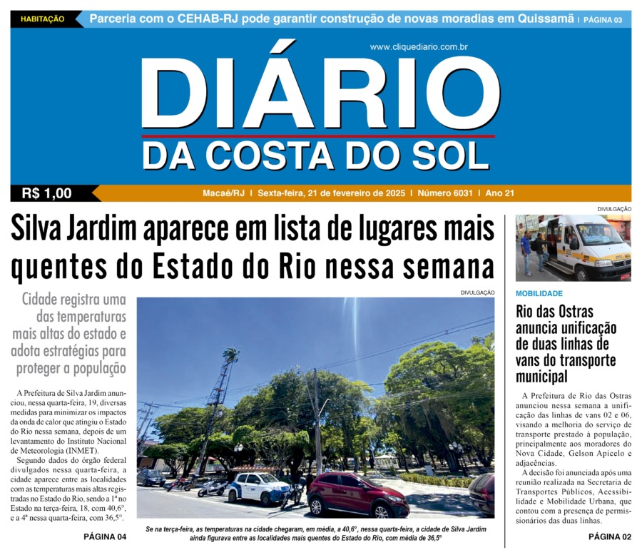 Edições Impressas Edição de sexta-feira 21/02/2025 nº 6031 Publicado em 21/02/2025 - 08:15 Escrito por Redação Notícias relacionadas:destaque Seguinte Edição de sábado a segunda-feira 22 a 24/02/2025 nº 6032 Anterior Edição de quinta-feira 20/02/2025 nº 6030 Redação Notícias Recentes Cabo Frio4 horas atrás Agentes de Cabo Frio recebem novo treinamento técnico para atuar em casos de poluição sonora Cabo Frio5 horas atrás Homem procurado por latrocínio é detido por agentes em Cabo Frio Cabo Frio5 horas atrás Representante da Guarda Civil de Cabo Frio compete na etapa final ao lado de jovens atletas Polícia5 horas atrás Prefeito de Rio das Ostras volta de Brasília com esperança de novos investimentos Cidades5 horas atrás Campos publica 8ª convocação e chama 374 professores substitutos para a rede municipal Esporte5 horas atrás De Saquarema para o Brasileirão: Vasco troca gramado de São Januário Cidades5 horas atrás Quissamã inicia planejamento educacional para 2026 com foco em Educação Financeira Polícia8 horas atrás Mulher é presa na RJ-106, em Saquarema, com R$ 38 mil em drogas e arma Saúde9 horas atrás Silva Jardim tem aulão em alusão à campanha mundial do Novembro Azul Mobilidade10 horas atrás Mobilidade promove fiscalização para verificar situação de táxis em Rio das Ostras Clique Diário E. L. Mídia Editora Ltda CNPJ: 09.298.880/0001-07 Redação: Rua Tupinambás 122 Gloria – Macaé/RJ comercial@diariocs.com (22) 2765-7353 (22) 999253130 Mais lidas da semana Cultura10 horas atrás Adilson Lopes apresenta exposição “Trajetória” em Casimiro de Abreu Cidades3 dias atrás Servidores de Rio das Ostras participam de treinamento do Estado em Búzios Polícia2 dias atrás Farmácia é interditada e uma pessoa é presa em Rio das Ostras em operação da Polícia Federal Cidades2 dias atrás Vereadores de Macaé vão embarcar nesta quinta para participar da COP 30 em Belém