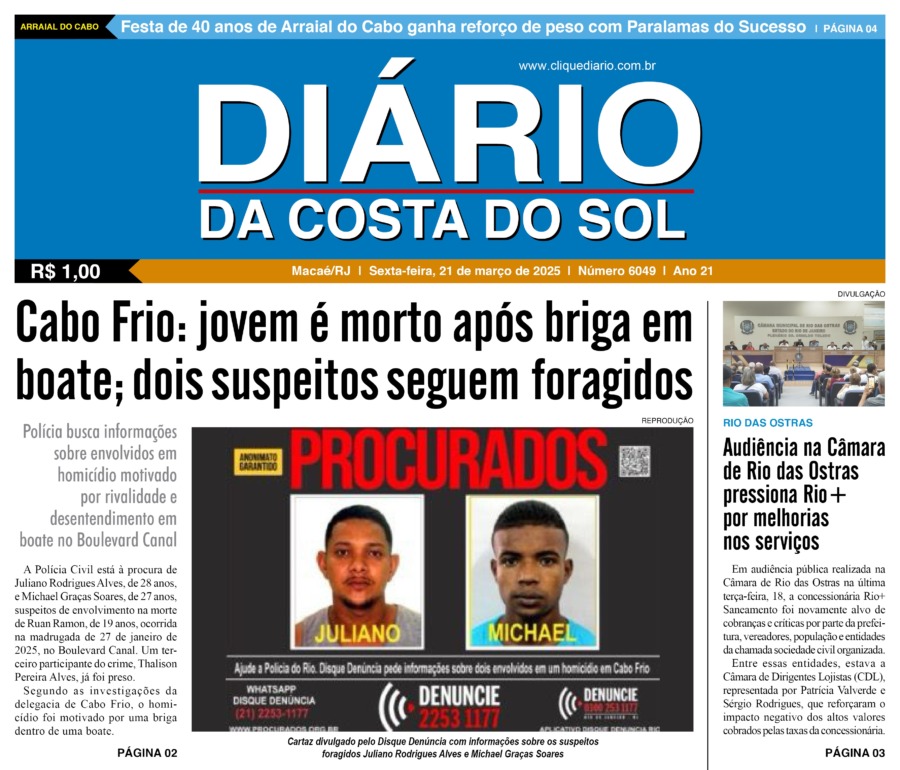 Edições Impressas Edição de sexta-feira 21/03/2025 nº 6049 Publicado em 21/03/2025 - 08:32 Escrito por Redação Notícias relacionadas: Seguinte Edição de sábado a segunda-feira, 22 a 24/03/2025 nº 6050 Anterior Edição de quinta-feira 20/03/2025 nº 6048 Redação Notícias Recentes Iguaba4 horas atrás Menina de Iguaba Grande realiza sonho e conhece o príncipe William no Rio de Janeiro Arraial do cabo4 horas atrás Arraial do Cabo é exemplo de tranquilidade na Região dos Lagos, segundo dados do ISP Arraial do cabo4 horas atrás Festival em Arraial do Cabo promete recorde de público com mais de 15 mil pratos e 10 mil litros de chope Arraial do cabo4 horas atrás Oficina une saúde, cidadania e acolhimento em Arraial do Cabo Arraial do cabo5 horas atrás Sucesso de público marca o primeiro dia da Arraial Expo XP Cabo Frio5 horas atrás Prefeitura de Cabo Frio premia autoras com experiências culturais e incentivo à leitura Cidades5 horas atrás Macaé realiza audiência pública do Projeto Macaé +20 no dia 10 de dezembro Polícia6 horas atrás Polícia Militar recupera celulares roubados após série de assaltos em Campos Educação6 horas atrás Mostra cultural do CIEP Mestre Marçal lota o Teatro de Rio das Ostras Polícia6 horas atrás Polícia prende 3 homens envolvidos com o tráfico em Rio das Ostras Clique Diário E. L. Mídia Editora Ltda CNPJ: 09.298.880/0001-07 Redação: Rua Tupinambás 122 Gloria – Macaé/RJ comercial@diariocs.com (22) 2765-7353 (22) 999253130 Mais lidas da semana Arraial do cabo1 dia atrás Arraial do Cabo celebra 3ª edição do Festival de Frutos do Mar com entrada livre; Carol Biazin, Ramona Rox, Liah Soares e mais Polícia4 dias atrás Homem é preso em Maricá depois de matar uma pessoa a facadas nessa madrugada Cidades3 dias atrás HFM ganha novo Pronto-Socorro moderno e ampliado em Campos Meio Ambiente1 dia atrás Ações do Programa Limpa Rio seguem em vários pontos de Rio das Ostras