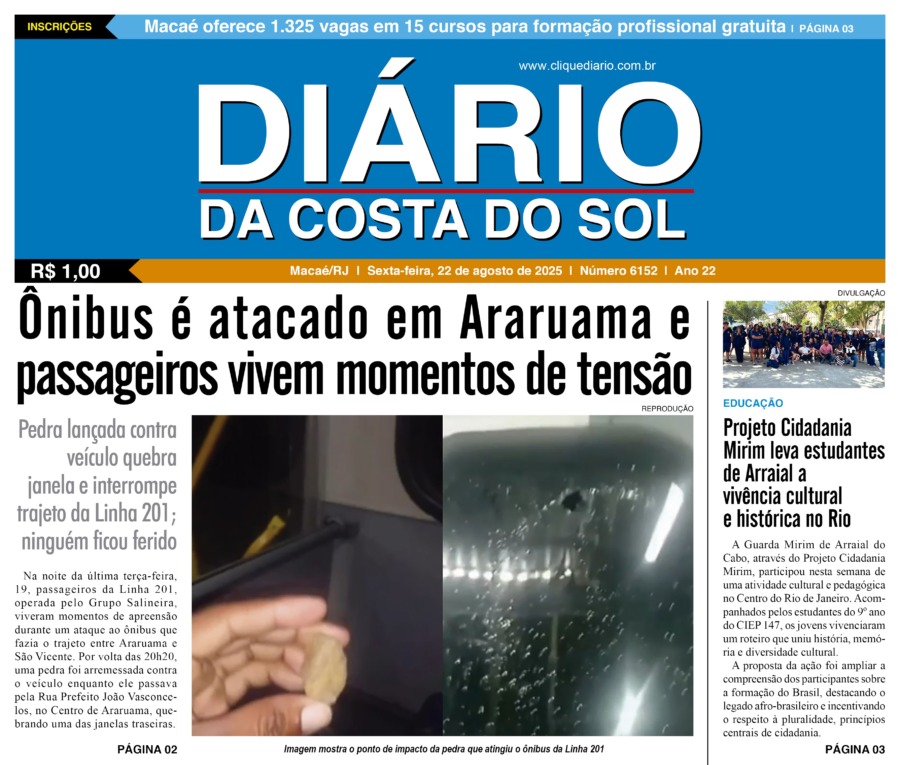 Edições Impressas Edição de sexta-feira 22/08/2025 nº 6152 Publicado em 22/08/2025 - 09:32 Escrito por Redação Notícias relacionadas: Seguinte Edição de sábado a segunda-feira 23 a 25/08/2025 nº 6153 Anterior Edição de quinta-feira 21/08/2025 nº 6151 Redação Notícias Recentes Cabo Frio1 dia atrás Estudantes de Cabo Frio brilham em premiação do projeto CaptaAção Meio Ambiente1 dia atrás Cepro promove encontro para discutir avanços e desafios da justiça climática em Rio das Ostras Armação dos Búzios2 dias atrás Búzios Swim celebra esporte, natureza e turismo na Região dos Lagos Cabo Frio2 dias atrás Educação pública de Cabo Frio colhe frutos com conquistas em competições científicas Edições Impressas2 dias atrás Edição de sábado a segunda-feira 08 a 10/11/2025 nº 6208 Polícia2 dias atrás Moto sem placa é abandonada após fuga de suspeito em Macaé Polícia2 dias atrás Polícia Civil prende homem em flagrante por tráfico de drogas no Parque Aeroporto, em Macaé Iguaba2 dias atrás Menina de Iguaba Grande realiza sonho e conhece o príncipe William no Rio de Janeiro Arraial do cabo2 dias atrás Arraial do Cabo é exemplo de tranquilidade na Região dos Lagos, segundo dados do ISP Arraial do cabo2 dias atrás Festival em Arraial do Cabo promete recorde de público com mais de 15 mil pratos e 10 mil litros de chope Clique Diário E. L. Mídia Editora Ltda CNPJ: 09.298.880/0001-07 Redação: Rua Tupinambás 122 Gloria – Macaé/RJ comercial@diariocs.com (22) 2765-7353 (22) 999253130 Mais lidas da semana Arraial do cabo4 dias atrás Arraial do Cabo celebra 3ª edição do Festival de Frutos do Mar com entrada livre; Carol Biazin, Ramona Rox, Liah Soares e mais Meio Ambiente4 dias atrás Programa do governo estadual promove limpeza de rio no Âncora, em Rio das Ostras Meio Ambiente3 dias atrás Ações do Programa Limpa Rio seguem em vários pontos de Rio das Ostras Cidades5 dias atrás HFM ganha novo Pronto-Socorro moderno e ampliado em Campos