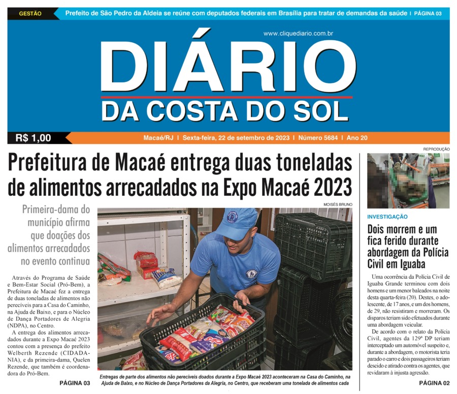 Edições Impressas Edição de sexta-feira 22/09/2023 nº 5684 Publicado em 22/09/2023 - 00:00 Escrito por Redação Notícias relacionadas: Seguinte Edição de sábado a segunda-feira 23 a 25/09/2023 nº 5685 Anterior Edição de quinta-feira 21/09/2023 nº 5683 Redação Notícias Recentes Cabo Frio1 dia atrás Estudantes de Cabo Frio brilham em premiação do projeto CaptaAção Meio Ambiente1 dia atrás Cepro promove encontro para discutir avanços e desafios da justiça climática em Rio das Ostras Armação dos Búzios2 dias atrás Búzios Swim celebra esporte, natureza e turismo na Região dos Lagos Cabo Frio2 dias atrás Educação pública de Cabo Frio colhe frutos com conquistas em competições científicas Edições Impressas2 dias atrás Edição de sábado a segunda-feira 08 a 10/11/2025 nº 6208 Polícia2 dias atrás Moto sem placa é abandonada após fuga de suspeito em Macaé Polícia2 dias atrás Polícia Civil prende homem em flagrante por tráfico de drogas no Parque Aeroporto, em Macaé Iguaba2 dias atrás Menina de Iguaba Grande realiza sonho e conhece o príncipe William no Rio de Janeiro Arraial do cabo2 dias atrás Arraial do Cabo é exemplo de tranquilidade na Região dos Lagos, segundo dados do ISP Arraial do cabo2 dias atrás Festival em Arraial do Cabo promete recorde de público com mais de 15 mil pratos e 10 mil litros de chope Clique Diário E. L. Mídia Editora Ltda CNPJ: 09.298.880/0001-07 Redação: Rua Tupinambás 122 Gloria – Macaé/RJ comercial@diariocs.com (22) 2765-7353 (22) 999253130 Mais lidas da semana Arraial do cabo4 dias atrás Arraial do Cabo celebra 3ª edição do Festival de Frutos do Mar com entrada livre; Carol Biazin, Ramona Rox, Liah Soares e mais Meio Ambiente4 dias atrás Programa do governo estadual promove limpeza de rio no Âncora, em Rio das Ostras Meio Ambiente3 dias atrás Ações do Programa Limpa Rio seguem em vários pontos de Rio das Ostras Cidades5 dias atrás HFM ganha novo Pronto-Socorro moderno e ampliado em Campos