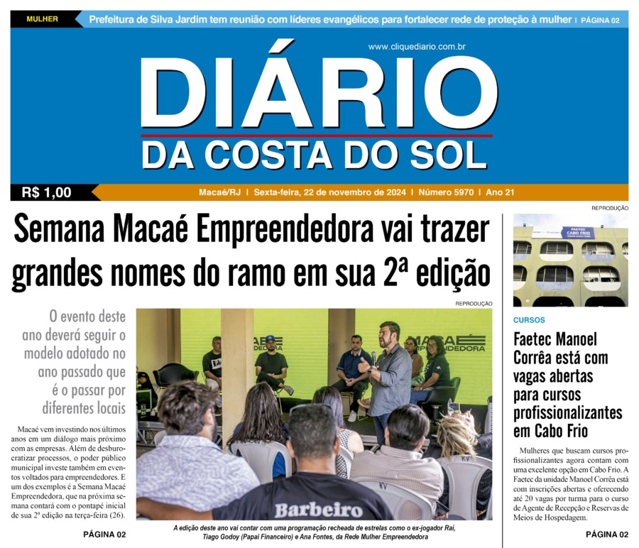 Edições Impressas Edição de sexta-feira 22/11/2024 nº 5970 Publicado em 22/11/2024 - 07:32 Escrito por Redação Notícias relacionadas: Seguinte Edição de sábado a segunda-feira 23 a 25/11/2024 nº 5971 Anterior Edição de quarta e quinta-feira 20 e 21/11/2024 nº 5969 Redação Notícias Recentes Cabo Frio7 horas atrás Reforma marca nova fase para o esporte cabo-friense e aniversário da cidade Arraial do cabo7 horas atrás Fórum de Arraial propõe novo modelo de desenvolvimento baseado nos 3Ds; Desvincular, Descarbonizar e Descontaminar Saúde8 horas atrás Saúde de Rio das Ostras promove mutirão de cirurgia pediátrica nessa semana Cidades8 horas atrás Guarda Ambiental resgata jiboia de três metros em área urbana de Macaé Cidades8 horas atrás Vereadores de Macaé vão embarcar nesta quinta para participar da COP 30 em Belém Arraial do cabo8 horas atrás Parceria com a PF fortalece preparo técnico da Segurança Pública de Arraial do Cabo Arraial do cabo8 horas atrás Iniciativa busca compensar emissões de carbono da frota de Arraial Cidades9 horas atrás Parceria com o Estado reforça prevenção de enchentes em Rio das Ostras há 39 dias do verão Desenvolvimento10 horas atrás Arteris vence novo leilão da BR-101 e mantém operação da via até 2047 Cidades10 horas atrás Prefeitura de Quissamã abre prazo para solicitação de isenção do IPTU 2026 e 2027 Clique Diário E. L. Mídia Editora Ltda CNPJ: 09.298.880/0001-07 Redação: Rua Tupinambás 122 Gloria – Macaé/RJ comercial@diariocs.com (22) 2765-7353 (22) 999253130 Mais lidas da semana Arraial do cabo7 dias atrás Arraial do Cabo celebra 3ª edição do Festival de Frutos do Mar com entrada livre; Carol Biazin, Ramona Rox, Liah Soares e mais Meio Ambiente6 dias atrás Ações do Programa Limpa Rio seguem em vários pontos de Rio das Ostras Cabo Frio6 dias atrás Música, poesia e memória celebram os 410 anos de Cabo Frio Polícia15 horas atrás Farmácia é interditada e uma pessoa é presa em Rio das Ostras em operação da Polícia Federal