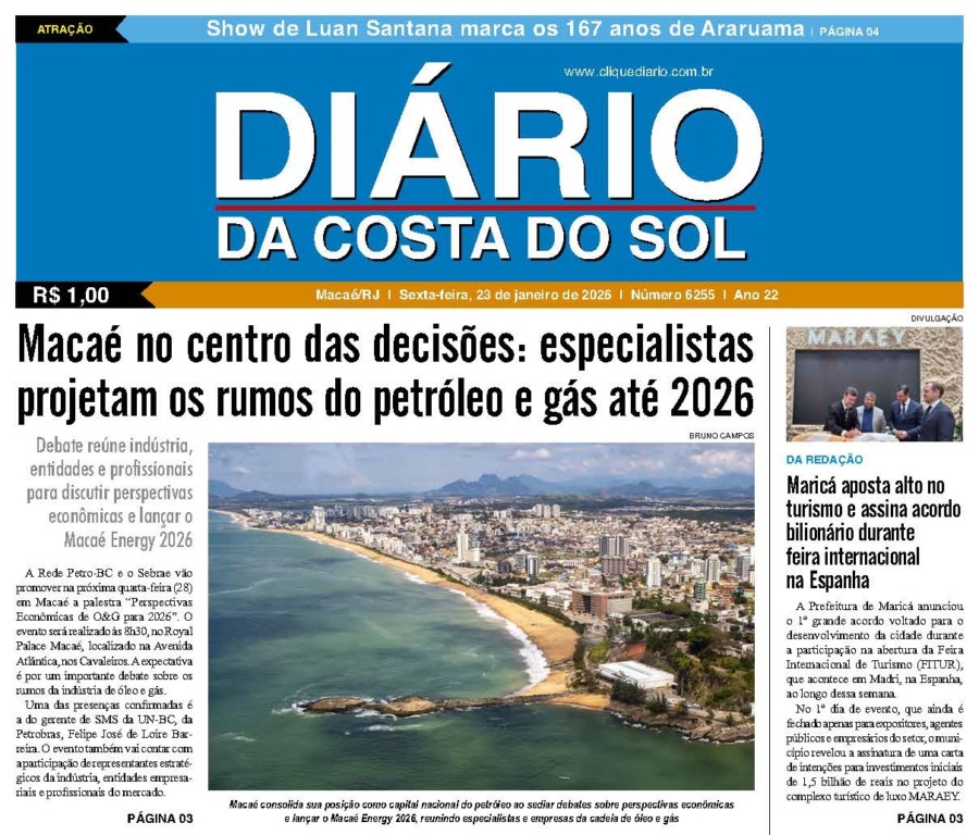 Edições Impressas Edição de sexta-feira 23/01/2026 nº 6255 Publicado em 23/01/2026 - 09:33 Escrito por Redação Notícias relacionadas: Anterior Edição de quinta-feira 22/01/2026 n° 6254 Redação Notícias Recentes Edições Impressas21 segundos atrás Edição de sexta-feira 23/01/2026 nº 6255 Cidades17 horas atrás Macaé recebe palestra sobre perspectivas econômicas do setor de óleo e gás Segurança Pública17 horas atrás Prefeito de Rio das Ostras participa de importante lançamento do Estado Cidades17 horas atrás Procon Macaé aponta grande variação de preços em material escolar Cabo Frio18 horas atrás Faetec oferece capacitação profissional gratuita para mulheres em Cabo Frio Iguaba18 horas atrás Iguaba Grande ajusta agenda por causa do clima e garante fim de semana musical Araruama18 horas atrás Show de Luan Santana marca os 167 anos de Araruama Arraial do cabo18 horas atrás Obras da Enel modernizam sistema elétrico em ruas de Arraial do Cabo Educação18 horas atrás Rio das Ostras divulga resultado preliminar de processo seletivo da Educação Cidades18 horas atrás Unimed Costa do Sol abre vagas de emprego na região Clique Diário E. L. Mídia Editora Ltda CNPJ: 09.298.880/0001-07 Redação: Rua Tupinambás 122 Gloria – Macaé/RJ comercial@diariocs.com (22) 2765-7353 (22) 999253130 Mais lidas da semana Segurança Pública17 horas atrás Prefeito de Rio das Ostras participa de importante lançamento do Estado Cultura7 dias atrás Show de Buchecha abre programação do Sesc Verão em Rio das Ostras nessa sexta, 16 Cidades23 horas atrás Macaé abre inscrições para escolinha de surf “Tirando Onda” Edições Impressas6 dias atrás Edição de sábado a segunda-feira 17 a 19/01/2026 nº 6251