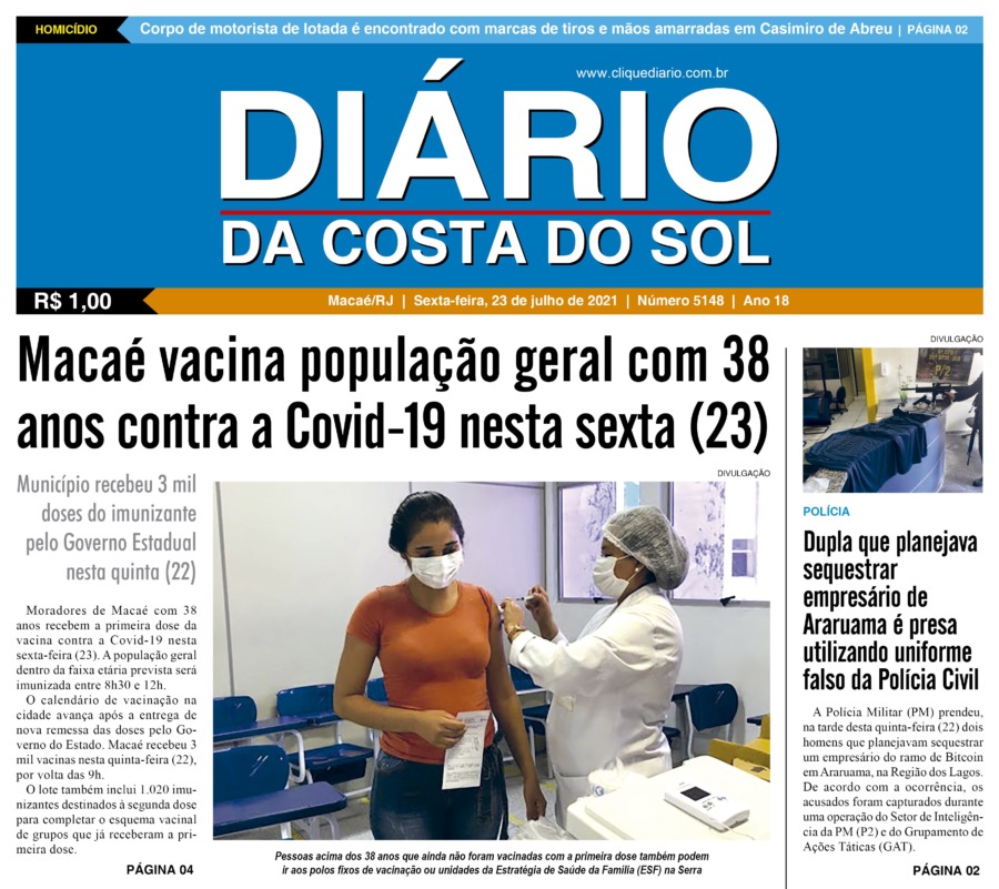 Edições Impressas Edição de sexta-feira 23/07/2021 n° 5148 Publicado em 23/07/2021 - 00:01 Escrito por Fernando Vitor Notícias relacionadas: Seguinte Edição de sábado a segunda-feira 24 a 26/07/2021 n° 5149 Anterior Edição de quinta-feira 22/07/2021 n° 5147 Fernando Vitor Notícias Recentes Cidades11 horas atrás Macaé registra avanço na coleta seletiva porta a porta e recolhe mais de 2 toneladas em 45 dias Meio Ambiente12 horas atrás Lagoa de Iriry, em Rio das Ostras, recebe nova sinalização focada em sustentabilidade Araruama12 horas atrás Araruama busca ampliar diálogo sobre saneamento antes de concluir revisão do PMSB Cabo Frio12 horas atrás Câmeras flagram colisão no restaurante Tia maluca seguida de fuga no Centro de Cabo Frio Cabo Frio12 horas atrás Cabo Frio reforça proteção ambiental após depredação na Trilha Translagunar Cabo Frio12 horas atrás Cabo Frio reúne especialistas para debater estratégias de enfrentamento às drogas Polícia13 horas atrás Homem morre e outro fica ferido em ataque a tiros em Travessão, em Campos dos Goytacazes Polícia13 horas atrás Polícia prende 2 homens em operação contra o tráfico de drogas em Rio das Ostras Arraial do cabo13 horas atrás Ação da Guarda Municipal e COMTRANS em Arraial coíbe prática perigosa em área turística Arraial do cabo13 horas atrás Município de Arraial organiza atividade crescente e amplia controle das rotas Clique Diário E. L. Mídia Editora Ltda CNPJ: 09.298.880/0001-07 Redação: Rua Tupinambás 122 Gloria – Macaé/RJ comercial@diariocs.com (22) 2765-7353 (22) 999253130 Mais lidas da semana Cultura4 dias atrás Adilson Lopes apresenta exposição “Trajetória” em Casimiro de Abreu Polícia6 dias atrás Farmácia é interditada e uma pessoa é presa em Rio das Ostras em operação da Polícia Federal Cidades7 dias atrás Servidores de Rio das Ostras participam de treinamento do Estado em Búzios Edições Impressas6 dias atrás Edição de quarta-feira 12/11/2025 nº 6210