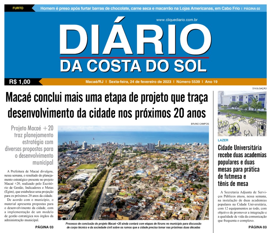 Edições Impressas Edição de sexta-feira 24/02/2023 nº 5539 Publicado em 24/02/2023 - 00:00 Escrito por Redação Notícias relacionadas: Seguinte Edição de sábado a segunda-feira 25 a 27_02_2023 nº 5540 Anterior Edição de quinta-feira 23/02/2023 nº 5538 Redação Notícias Recentes Saúde19 horas atrás Eventos esportivo e cultural reforça campanha do Outubro Rosa em Rio das Ostras nesse domingo, 26 Edições Impressas22 horas atrás Sábado a segunda-feira 25 a 27/10/2025 nº 6197 Cidades24 horas atrás Shopping Plaza Macaé oferece programação gratuita com feira de adoção e show de pagode neste fim de semana Cidades2 dias atrás 32º BPM completa 23 anos com solenidade de celebração e reconhecimento aos policiais Armação dos Búzios2 dias atrás Búzios celebra esporte e superação com XC RUN 2025 Araruama2 dias atrás Araruama promove saúde, lazer e cidadania em evento comunitário Arraial do cabo2 dias atrás Educação e sustentabilidade se encontram para jovens de Arraial do Cabo Cidades2 dias atrás Quissamã avança na reformulação do Currículo Municipal de Educação Arraial do cabo2 dias atrás PIPE estimula presença e desempenho de alunos da rede pública de Arraial em programa estudantil Cabo Frio2 dias atrás Prefeitura de Cabo Frio prepara espaço para visitação no Dia de Finados Clique Diário E. L. Mídia Editora Ltda CNPJ: 09.298.880/0001-07 Redação: Rua Tupinambás 122 Gloria – Macaé/RJ comercial@diariocs.com (22) 2765-7353 (22) 999253130 Mais lidas da semana Cultura6 dias atrás Silva Jardim anuncia shows gratuitos de samba e pagode para o fim de semana Cabo Frio6 dias atrás Serviços essenciais permanecem ativos durante ponto facultativo em Cabo Frio Polícia6 dias atrás Policiais da PRF salvam bebê engasgado na BR-101, em Campos Arraial do cabo6 dias atrás Prisão em flagrante marca operação da Patrulha Maria da Penha em Arraial do Cabo