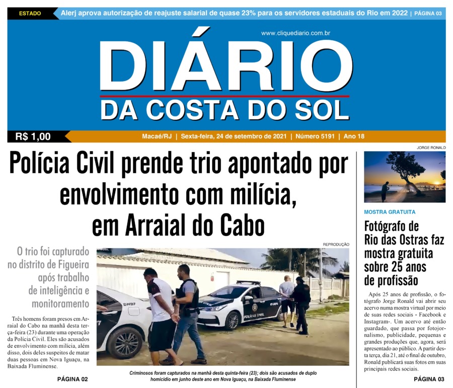 Edições Impressas Edição de sexta-feira 24/09/2021 n° 5191 Publicado em 24/09/2021 - 00:01 Escrito por Fernando Vitor Notícias relacionadas: Seguinte Edição de sábado a segunda-feira 25 a 27/09/2021 n° 5192 Anterior Edição de quinta-feira 23/09/2021 n° 5190 Fernando Vitor Notícias Recentes Cabo Frio9 horas atrás Cabo Frio realiza manhã de prevenção na sede da Guarda Civil Infraestrutura10 horas atrás Maricá anuncia obras de infraestrutura de mais de 50 km em Itaipuaçu Cidades14 horas atrás Macaé recebe neste domingo a XRun – 3ª Etapa com Meia Maratona Edições Impressas1 dia atrás Edição de sábado a segunda-feira 22 a 24/11/2025 nº 6217 Cultura2 dias atrás Espetáculo de dança se apresenta nesse sábado, 22, no Teatro de Rio das Ostras São Pedro da Aldeia2 dias atrás São Pedro da Aldeia movimenta praças e equipamentos culturais Cabo Frio2 dias atrás Cabo Frio impulsiona negócios locais com a Feira + Forte Cidades2 dias atrás Orla da Imbetiba recebe Feira Multicultural “Afro Macaé” neste sábado Cultura2 dias atrás Festa do Feijão começa nessa sexta-feira, 21, em Cantagalo, em Rio das Ostras Cidades2 dias atrás Quissamã celebra Consciência Negra com atividades culturais em escolas municipais Clique Diário E. L. Mídia Editora Ltda CNPJ: 09.298.880/0001-07 Redação: Rua Tupinambás 122 Gloria – Macaé/RJ comercial@diariocs.com (22) 2765-7353 (22) 999253130 Mais lidas da semana Desenvolvimento4 dias atrás Rio das Ostras estreita relações com a Rede Petro BC de olho em eventos do setor de energia em 2026 Cabo Frio3 dias atrás Cabo Frio promove ação do projeto Capoeiragem para registro de documentário Cultura4 dias atrás Moda e Prosa Caipira tem sua 6ª edição nessa quinta, 20, em Saquarema Meio Ambiente6 dias atrás Lagoa de Iriry, em Rio das Ostras, recebe nova sinalização focada em sustentabilidade