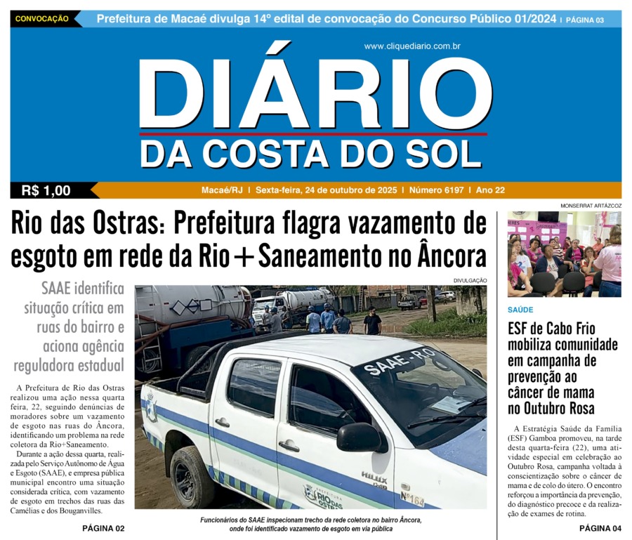 Edições Impressas Edição de sexta-feira 24/10/2025 nº 6197 Publicado em 24/10/2025 - 09:32 Escrito por Redação Notícias relacionadas: Seguinte Edição de sábado a segunda-feira 25 a 27/10/2025 nº 6198 Anterior Edição de quinta-feira 23/10/2025 nº 6196 Redação Notícias Recentes Cidades1 hora atrás Sana celebra 123 anos com programação cultural especial Cidades1 hora atrás Silas Andrade brilha e coloca Macaé no pódio da Copa Latino-Americana de BMX Polícia2 horas atrás Furto de celular leva a prisão de um casal em Macaé Cidades2 horas atrás Silva Jardim segue o Estado e transfere ponto facultativo para sexta, 31 Cultura2 horas atrás Prêmio Literário reúne rede pública municipal no Teatro de Rio das Ostras nessa quarta, 29 Edições Impressas3 horas atrás Edição de terça-feira 28/10/2025 nº 6199 Polícia3 horas atrás Polícia prende homem com quase meio quilo de drogas em Rio das Ostras Cidades20 horas atrás Macaé realizou 5ª Corrida e Caminhada Outubro Rosa Novembro Azul na orla da Imbetiba Cidades20 horas atrás Rio das Ostras autua Rio+ por mais um caso de vazamento de esgoto na cidade Cabo Frio20 horas atrás Ação da Prefeitura e AAMA leva reflexão sobre autocuidado e prevenção do câncer de mama em Cabo Frio Clique Diário E. L. Mídia Editora Ltda CNPJ: 09.298.880/0001-07 Redação: Rua Tupinambás 122 Gloria – Macaé/RJ comercial@diariocs.com (22) 2765-7353 (22) 999253130 Mais lidas da semana Edições Impressas3 dias atrás Edição de sábado a segunda-feira 25 a 27/10/2025 nº 6198 Edições Impressas6 dias atrás Edição de quarta-feira 22/10/2025 nº 6195 Edições Impressas5 dias atrás Edição de quinta-feira 23/10/2025 nº 6196 Cidades4 dias atrás Macaé Cup vai agitar a serra com o maior torneio de futebol infantil da região