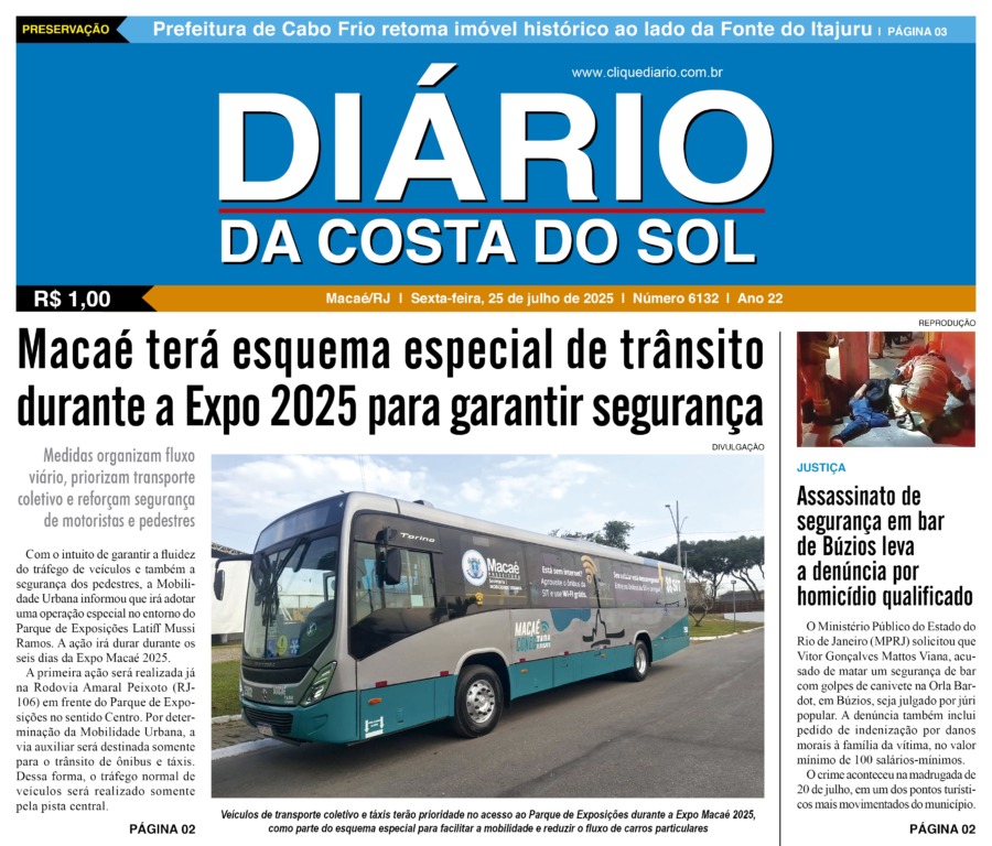 Edições Impressas Edição de sexta-feira 25/07/2025 nº 6132 Publicado em 25/07/2025 - 09:32 Escrito por Redação Notícias relacionadas: Seguinte Edição de Sábado a segunda-feira 26 a 28/07/2025 nº 6133 Anterior Edição de quinta-feira 24/07/2025 nº 6131 Redação Notícias Recentes Cidades6 horas atrás 32º BPM completa 23 anos com solenidade de celebração e reconhecimento aos policiais Armação dos Búzios6 horas atrás Búzios celebra esporte e superação com XC RUN 2025 Araruama7 horas atrás Araruama promove saúde, lazer e cidadania em evento comunitário Arraial do cabo7 horas atrás Educação e sustentabilidade se encontram para jovens de Arraial do Cabo Cidades7 horas atrás Quissamã avança na reformulação do Currículo Municipal de Educação Arraial do cabo7 horas atrás PIPE estimula presença e desempenho de alunos da rede pública de Arraial em programa estudantil Cabo Frio7 horas atrás Prefeitura de Cabo Frio prepara espaço para visitação no Dia de Finados Polícia7 horas atrás Dois homens são presos após furto a residência em Campos Cabo Frio7 horas atrás Câmara de Cabo Frio recebe debate sobre finanças municipais Cabo Frio7 horas atrás Projeto Mar Sem Lixo promove mostra ambiental com apoio da Secretaria de Meio Ambiente em Cabo Frio Clique Diário E. L. Mídia Editora Ltda CNPJ: 09.298.880/0001-07 Redação: Rua Tupinambás 122 Gloria – Macaé/RJ comercial@diariocs.com (22) 2765-7353 (22) 999253130 Mais lidas da semana Cultura4 dias atrás Silva Jardim anuncia shows gratuitos de samba e pagode para o fim de semana Cabo Frio4 dias atrás Serviços essenciais permanecem ativos durante ponto facultativo em Cabo Frio Cabo Frio4 dias atrás Atletas de várias cidades se enfrentam em competição de Muay Thai em Cabo Frio Polícia4 dias atrás Policiais da PRF salvam bebê engasgado na BR-101, em Campos