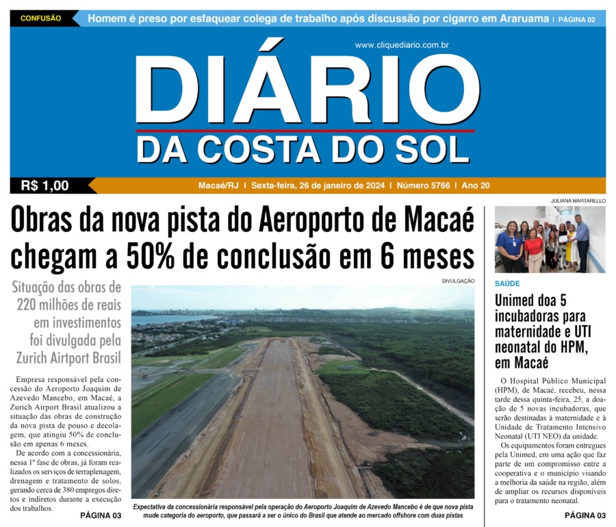 Edições Impressas Edição de sexta-feira 26/01/2024 nº 5766 Publicado em 26/01/2024 - 00:00 Escrito por Redação Notícias relacionadas: Seguinte Edição de sábado a segunda-feira 27 a 29/01_2024 nº 5767 Anterior Edição de quinta-feira 25/01/2024 nº 5765 Redação Notícias Recentes Cabo Frio13 minutos atrás Cabo Frio realiza evento de saúde e bem-estar no Outubro Rosa Cabo Frio19 minutos atrás Especialistas discutem entrega legal e proteção à infância em Cabo Frio Greve2 horas atrás TJRJ considera greve do Sepe irregular e determina retomada imediata das aulas em Rio das Ostras Cidadania3 horas atrás Plano Diretor de Rio das Ostras é tema de fórum da sociedade civil nesse sábado, 25 Saúde3 horas atrás Saquarema reforça luta contra o câncer de mama com Pedalada Outubro Rosa nesse domingo, 26 Cidades4 horas atrás Macaé Cup vai agitar a serra com o maior torneio de futebol infantil da região Cidades4 horas atrás Projeto “Cultura in Cine CIDENNF” leva cinema gratuito ao Campo das Malvinas em Macaé Polícia4 horas atrás Operação da PM encontra mais de duas mil cápsulas de cocaína em Rio das Ostras Polícia4 horas atrás Rua do tráfico: PM prende 5º traficante na mesma rua em Rio das Ostras em menos de uma semana Polícia4 horas atrás Denúncia anônima leva polícia a recuperar três carros roubados em Macaé Clique Diário E. L. Mídia Editora Ltda CNPJ: 09.298.880/0001-07 Redação: Rua Tupinambás 122 Gloria – Macaé/RJ comercial@diariocs.com (22) 2765-7353 (22) 999253130 Mais lidas da semana Cultura4 dias atrás Silva Jardim anuncia shows gratuitos de samba e pagode para o fim de semana Polícia4 dias atrás Policiais da PRF salvam bebê engasgado na BR-101, em Campos Cabo Frio4 dias atrás Atletas de várias cidades se enfrentam em competição de Muay Thai em Cabo Frio Cabo Frio4 dias atrás Serviços essenciais permanecem ativos durante ponto facultativo em Cabo Frio