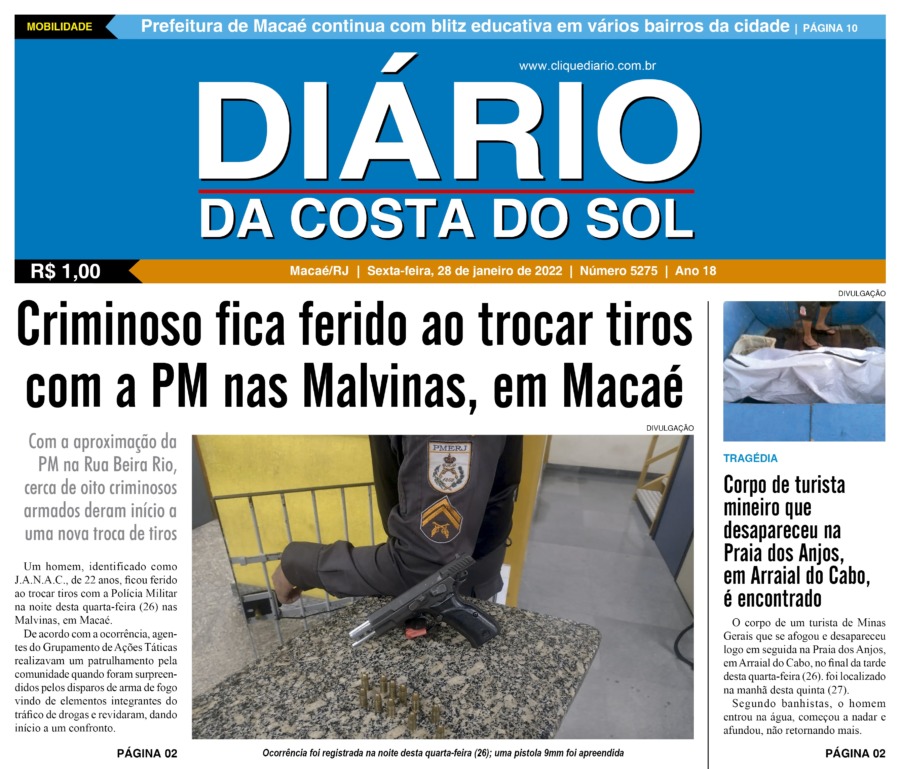 Edições Impressas Edição de sexta-feira 28/01/2022 nº 5275 Publicado em 28/01/2022 - 06:35 Escrito por Fernando Vitor Notícias relacionadas: Seguinte Edição de sábado a segunda-feira, 29 a 31/01/2022 nº 5276 Anterior Edição de quinta-feira 27/01/2022 nº 5274 Fernando Vitor Notícias Recentes Edições Impressas1 hora atrás Edição de sábado a segunda-feira 29_11 a 01/12/2025 nº 6222 Cidades2 horas atrás Macaé recebe Super Mundialito de Altinha e etapa do Circuito de Ondas Sustentáveis Arraial do cabo18 horas atrás Ação em Arraial do Cabo resulta na apreensão de quase 800 buchas de maconha Arraial do cabo18 horas atrás Procon de Arraial do Cabo orienta lojistas e consumidores na Black Friday Cabo Frio18 horas atrás Cabo Frio apresenta avanços em integração entre áreas rurais e sistemas aquáticos Cidades18 horas atrás Quissamã apresenta LOA 2026 com orçamento previsto de R$ 533 milhões Cabo Frio18 horas atrás Cabo Frio recebe competição estadual de levantamento de peso neste sábado Cabo Frio18 horas atrás Operação em Cabo Frio remove produtos para animais sem validade e embalagens Cabo Frio19 horas atrás Cabo Frio intensifica fiscalização e retira acampamentos ilegais em pontos sensíveis Cidades19 horas atrás Moradora de Rio das Ostras é destaque de programa de TV de Cissa Guimarães Clique Diário E. L. Mídia Editora Ltda CNPJ: 09.298.880/0001-07 Redação: Rua Tupinambás 122 Gloria – Macaé/RJ comercial@diariocs.com (22) 2765-7353 (22) 999253130 Mais lidas da semana Cidades19 horas atrás Moradora de Rio das Ostras é destaque de programa de TV de Cissa Guimarães Cabo Frio3 dias atrás Cabo Frio: Guarda Municipal comemora 65 anos com estrutura reforçada Saúde4 dias atrás Rio das Ostras amplia vacinação contra HPV até dezembro para jovens até 19 anos Sem categoria4 dias atrás Arraial do Cabo inicia operação para padronizar quadriciclos e similares