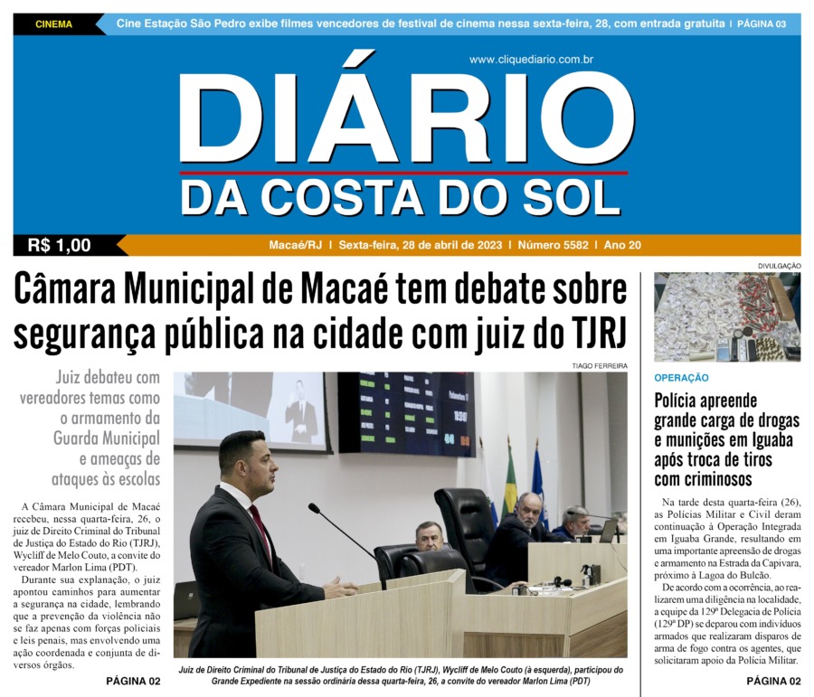 Edições Impressas Edição de sexta-feira 28/04/2023 nº 5582 Publicado em 27/04/2023 - 23:55 Escrito por Redação Notícias relacionadas: Seguinte Edição de sábado a terça-feira 29/04 a 02/05/2023 nº 5583 Anterior Edição de quinta-feira 27/04/2023 nº 5581 Redação Notícias Recentes Sem categoria4 horas atrás Arraial do Cabo cria área de convivência voltada à educação ambiental Segurança Pública5 horas atrás Prefeito de Rio das Ostras pede aumento do efetivo da PM durante o verão Cidades5 horas atrás Macaé participa do XII Congresso Brasileiro de Guardas Municipais e Segurança Pública Cidades5 horas atrás Quissamã reúne gestores das escolas de tempo integral para planejar ações de 2026 Cabo Frio5 horas atrás Cabo Frio reúne pesquisadores e gestores em evento estratégico Cultura5 horas atrás Sindicomércio anuncia Sesc Verão 2026 em Rio das Ostras e Casimiro de Abreu Cabo Frio6 horas atrás Cabo Frio: Procon cobra melhorias da Enel após sucessivas quedas de energia Arraial do cabo6 horas atrás Arraial do Cabo: Mobilização cultural marca edição do Fórum Municipal Cabo Frio6 horas atrás Cabo Frio: Guarda Municipal comemora 65 anos com estrutura reforçada Cabo Frio6 horas atrás Manhã de prevenção mobiliza Guarda Civil de Cabo Frio Clique Diário E. L. Mídia Editora Ltda CNPJ: 09.298.880/0001-07 Redação: Rua Tupinambás 122 Gloria – Macaé/RJ comercial@diariocs.com (22) 2765-7353 (22) 999253130 Mais lidas da semana Cabo Frio6 dias atrás Cabo Frio promove ação do projeto Capoeiragem para registro de documentário Cultura5 horas atrás Sindicomércio anuncia Sesc Verão 2026 em Rio das Ostras e Casimiro de Abreu Saúde1 dia atrás Rio das Ostras amplia vacinação contra HPV até dezembro para jovens até 19 anos Sem categoria1 dia atrás Arraial do Cabo inicia operação para padronizar quadriciclos e similares