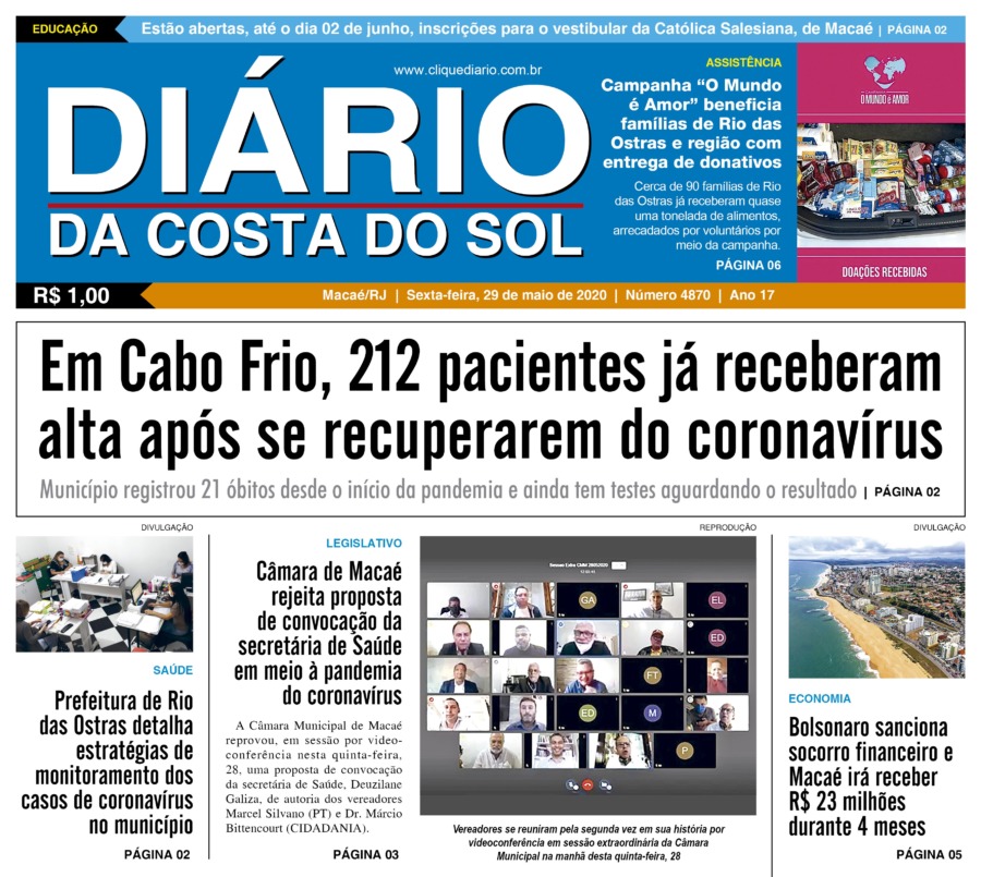 Edições Impressas Edição de sexta-feira 29/05/2020 nº 4870 Publicado em 29/05/2020 - 05:00 Escrito por Fernando Vitor Notícias relacionadas: Seguinte Edição de Sáb a Seg 30/05 a 01/06/2020 nº 4871 Anterior Edição de quinta-feira 28/05/2020 nº 4869 Fernando Vitor Notícias Recentes Cidades43 minutos atrás Macaé realizou 5ª Corrida e Caminhada Outubro Rosa Novembro Azul na orla da Imbetiba Cidades46 minutos atrás Rio das Ostras autua Rio+ por mais um caso de vazamento de esgoto na cidade Cabo Frio52 minutos atrás Ação da Prefeitura e AAMA leva reflexão sobre autocuidado e prevenção do câncer de mama em Cabo Frio Cidades54 minutos atrás Casa do Servidor em Macaé ultrapassa 7 mil atendimentos em oito meses de funcionamento Polícia1 hora atrás Foragido da Justiça é preso pela PM na BR-101 em Campos Araruama1 hora atrás Prefeitura define plano de segurança integrado para a Expo Araruama Iguaba1 hora atrás Prefeitura de Iguaba Grande prepara nova turma de aprendizes para atuação em órgãos públicos Cabo Frio1 hora atrás Mostra de Dança movimenta Cabo Frio com apresentações, solidariedade e cultura local Cabo Frio2 horas atrás Cabo Frio dá início à formação obrigatória para ambulantes das praias Polícia2 horas atrás Homem é preso com rádios transmissores em depósito de Casimiro de Abreu Clique Diário E. L. Mídia Editora Ltda CNPJ: 09.298.880/0001-07 Redação: Rua Tupinambás 122 Gloria – Macaé/RJ comercial@diariocs.com (22) 2765-7353 (22) 999253130 Mais lidas da semana Edições Impressas5 dias atrás Edição de quarta-feira 22/10/2025 nº 6195 Arraial do cabo7 dias atrás Prisão em flagrante marca operação da Patrulha Maria da Penha em Arraial do Cabo Cultura6 dias atrás Música, emoção e cores: Rodrigo Pontes apresenta show especial em Rio das Ostras Edições Impressas4 dias atrás Edição de quinta-feira 23/10/2025 nº 6196