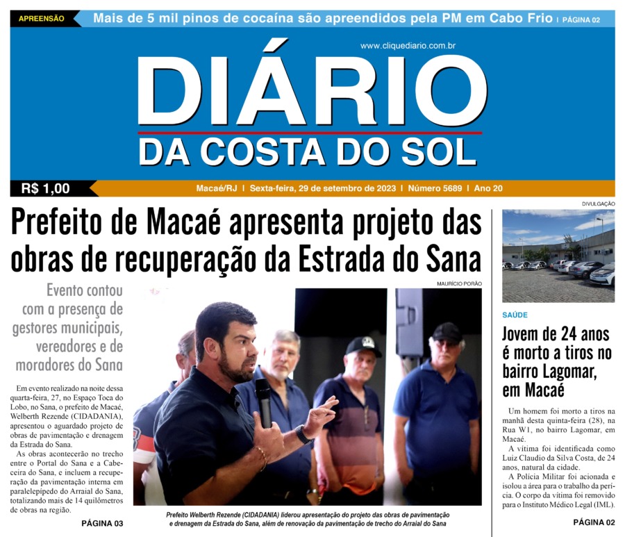 Edições Impressas Edição de sexta-feira 29/09/2023 nº 5689 Publicado em 28/09/2023 - 23:55 Escrito por Redação Notícias relacionadas: Seguinte Edição de sábado a segunda-feira 30/09 a 02/10/2023 nº 5690 Anterior Edição de quinta-feira 28/09/2023 nº 5688 Redação Notícias Recentes Cabo Frio22 horas atrás Estudantes de Cabo Frio brilham em premiação do projeto CaptaAção Armação dos Búzios1 dia atrás Búzios Swim celebra esporte, natureza e turismo na Região dos Lagos Cabo Frio1 dia atrás Educação pública de Cabo Frio colhe frutos com conquistas em competições científicas Edições Impressas1 dia atrás Edição de sábado a segunda-feira 08 a 10/11/2025 nº 6208 Polícia1 dia atrás Moto sem placa é abandonada após fuga de suspeito em Macaé Polícia1 dia atrás Polícia Civil prende homem em flagrante por tráfico de drogas no Parque Aeroporto, em Macaé Iguaba2 dias atrás Menina de Iguaba Grande realiza sonho e conhece o príncipe William no Rio de Janeiro Arraial do cabo2 dias atrás Arraial do Cabo é exemplo de tranquilidade na Região dos Lagos, segundo dados do ISP Arraial do cabo2 dias atrás Festival em Arraial do Cabo promete recorde de público com mais de 15 mil pratos e 10 mil litros de chope Arraial do cabo2 dias atrás Oficina une saúde, cidadania e acolhimento em Arraial do Cabo Clique Diário E. L. Mídia Editora Ltda CNPJ: 09.298.880/0001-07 Redação: Rua Tupinambás 122 Gloria – Macaé/RJ comercial@diariocs.com (22) 2765-7353 (22) 999253130 Mais lidas da semana Arraial do cabo3 dias atrás Arraial do Cabo celebra 3ª edição do Festival de Frutos do Mar com entrada livre; Carol Biazin, Ramona Rox, Liah Soares e mais Meio Ambiente4 dias atrás Programa do governo estadual promove limpeza de rio no Âncora, em Rio das Ostras Meio Ambiente3 dias atrás Ações do Programa Limpa Rio seguem em vários pontos de Rio das Ostras Turismo6 dias atrás Saquarema celebra reconhecimento de projeto pelo Ministério do Turismo