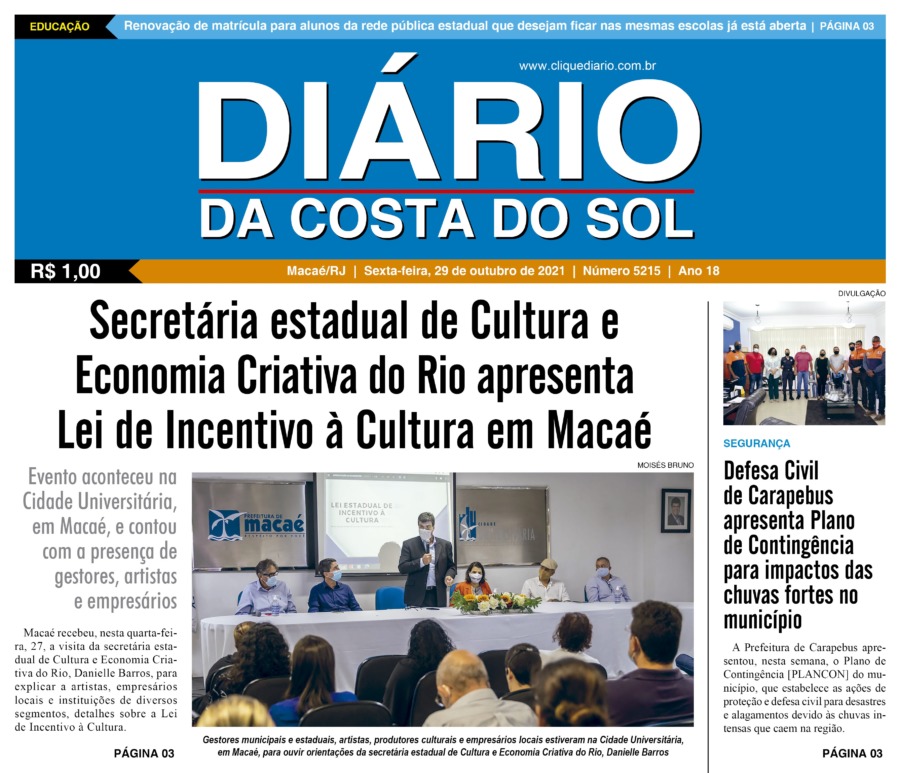 Edições Impressas Edição de sexta-feira 29/10/2021 nº 5215 Publicado em 29/10/2021 - 00:09 Escrito por Fernando Vitor Notícias relacionadas: Seguinte Edição de sábado a quarta-feira 30/10 a 03/11/2021 nº 5216 Anterior Edição de quinta-feira 28/10/2021 nº 5214 Fernando Vitor Notícias Recentes Armação dos Búzios13 horas atrás Búzios atinge 80% de ocupação no feriado Cabo Frio14 horas atrás Cabo Frio prepara esquema especial de segurança nas praias e áreas de lazer Cabo Frio14 horas atrás Cabo Frio realiza ações de proteção a fauna após aparecimento de animais em bairros Cabo Frio14 horas atrás Cabo Frio reúne especialistas em evento do programa “Vim Cuidar de Você” Desenvolvimento14 horas atrás Rio das Ostras estreita relações com a Rede Petro BC de olho em eventos do setor de energia em 2026 Cabo Frio14 horas atrás Aula-passeio apresenta riqueza cultural e ambiental de Cabo Frio na Fazenda Campos Novos Cabo Frio14 horas atrás Cabo Frio suspende expediente em órgãos públicos nesta sexta Cidades15 horas atrás Macaé terá Dia do Futebol Feminino e programa para valorização da mulher rural Arraial do cabo15 horas atrás Carreta científica desembarca em Arraial do Cabo com programação gratuita Polícia15 horas atrás Polícia Civil prende liderança do ADA no bairro Fronteira em Macaé Clique Diário E. L. Mídia Editora Ltda CNPJ: 09.298.880/0001-07 Redação: Rua Tupinambás 122 Gloria – Macaé/RJ comercial@diariocs.com (22) 2765-7353 (22) 999253130 Mais lidas da semana Cultura6 dias atrás Adilson Lopes apresenta exposição “Trajetória” em Casimiro de Abreu Desenvolvimento14 horas atrás Rio das Ostras estreita relações com a Rede Petro BC de olho em eventos do setor de energia em 2026 Cidades3 dias atrás Macaé registra avanço na coleta seletiva porta a porta e recolhe mais de 2 toneladas em 45 dias Mobilidade6 dias atrás Mobilidade promove fiscalização para verificar situação de táxis em Rio das Ostras