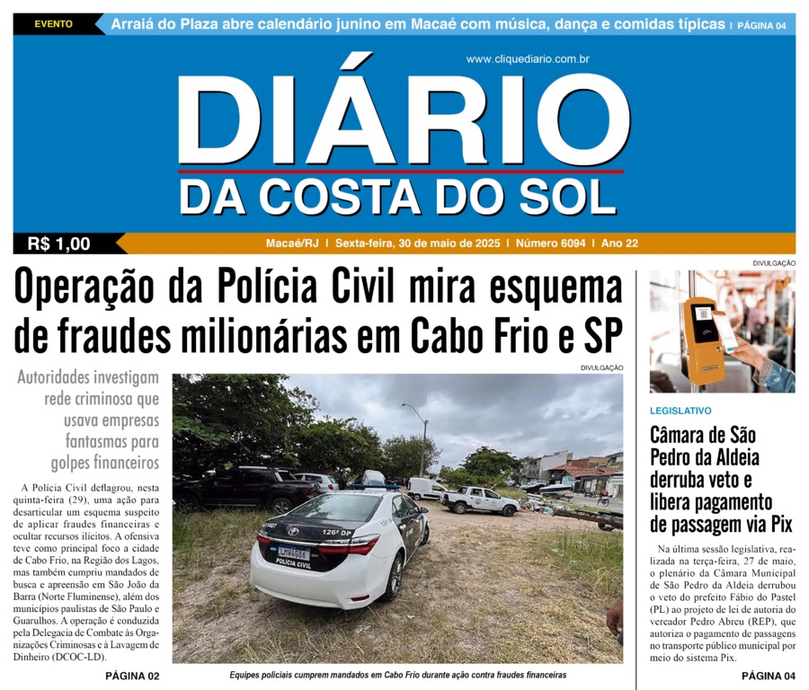 Edições Impressas Edição de sexta-feira 30/05/2025 nº 6094 Publicado em 30/05/2025 - 08:10 Escrito por Redação Notícias relacionadas: Seguinte Edição de sábado a segunda-feira 31/05 a 02/06/2025 nº 6095 Anterior Edição de quinta-feira 29/05/2025 nº 6093 Redação Notícias Recentes Cidades4 horas atrás Macaé discute armamento da Guarda Municipal como parte de ações para fortalecer a segurança pública Araruama4 horas atrás Presos em Araruama tinham mandados por roubo e associação criminosa Educação4 horas atrás Inscrição para vagas nas creches de Rio das Ostras em 2026 termina nessa sexta, 14 Cabo Frio4 horas atrás Cabo Frio executa nova etapa de sinalização horizontal na cidade Cidades4 horas atrás Agricultores e pecuaristas de Quissamã participam de encontro de capacitação e orientação técnica Arraial do cabo4 horas atrás Nova licença digital promete mais agilidade e transparência em Arraial do Cabo Polícia4 horas atrás Idoso é assassinado a tiros às margens da BR-101, em Campos Esporte5 horas atrás Atletas de Rio das Ostras e Saquarema conquistam título de brasileiro de bodyboarding Arraial do cabo5 horas atrás Sucesso de vendas faz pratos especiais continuarem até o fim de novembro em Arraial no Festival de Frutos do Mar Cabo Frio5 horas atrás Iniciativa reforça compromisso com a identidade cultural cabo-friense Clique Diário E. L. Mídia Editora Ltda CNPJ: 09.298.880/0001-07 Redação: Rua Tupinambás 122 Gloria – Macaé/RJ comercial@diariocs.com (22) 2765-7353 (22) 999253130 Mais lidas da semana Cidades2 dias atrás Servidores de Rio das Ostras participam de treinamento do Estado em Búzios Polícia1 dia atrás Farmácia é interditada e uma pessoa é presa em Rio das Ostras em operação da Polícia Federal Polícia6 dias atrás Polícia prende 3 homens envolvidos com o tráfico em Rio das Ostras Cidades1 dia atrás Vereadores de Macaé vão embarcar nesta quinta para participar da COP 30 em Belém