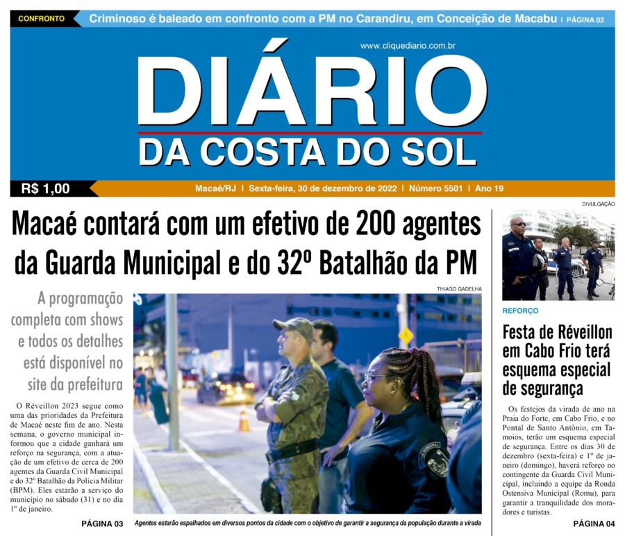 Edições Impressas Edição de sexta-feira 30/12/2022 nº 5501 Publicado em 30/12/2022 - 00:00 Escrito por Redação Notícias relacionadas: Seguinte Edição de sábado a segunda-feira 31/12/2022 a 02/01/2023 nº 5502 Anterior Edição de quinta-feira 29/12/2022 nº 5500 Redação Notícias Recentes Arraial do cabo18 minutos atrás ROMU intercepta motociclista que tentou fugir após empinar moto em Arraial do Cabo Polícia27 minutos atrás Polícia apreende mais de 10 mil reais em bebidas sem nota fiscal em Rio das Ostras Arraial do cabo42 minutos atrás Ação conjunta entre CPROEIS e PATAMO prende suspeito com drogas em Arraial do Cabo Sem categoria2 horas atrás Atleta do Cabo Frio + Esporte é destaque na Corrida do Guardião Cidades4 horas atrás Mulheres de Saquarema participam de atividade lúdica sobre autoconhecimento Diversão4 horas atrás Silva Jardim celebra o Mês das Crianças com mais uma atividade no Centro Polícia4 horas atrás Polícia descobre esconderijo do tráfico e apreende grande quantidade de drogas em Macaé Polícia5 horas atrás Homem é preso com 105 cápsulas de cocaína em localidade de Rio das Ostras Polícia5 horas atrás Criminoso foge após perseguição e drogas são apreendidas em Macaé Polícia5 horas atrás Traficante é preso em Macaé após perseguição policial no Parque Aeroporto Clique Diário E. L. Mídia Editora Ltda CNPJ: 09.298.880/0001-07 Redação: Rua Tupinambás 122 Gloria – Macaé/RJ comercial@diariocs.com (22) 2765-7353 (22) 999253130 Mais lidas da semana Cabo Frio7 dias atrás Serviços essenciais permanecem ativos durante ponto facultativo em Cabo Frio Cultura6 dias atrás Música, emoção e cores: Rodrigo Pontes apresenta show especial em Rio das Ostras Cabo Frio7 dias atrás Atletas de várias cidades se enfrentam em competição de Muay Thai em Cabo Frio Edições Impressas5 dias atrás Edição de quarta-feira 22/10/2025 nº 6195
