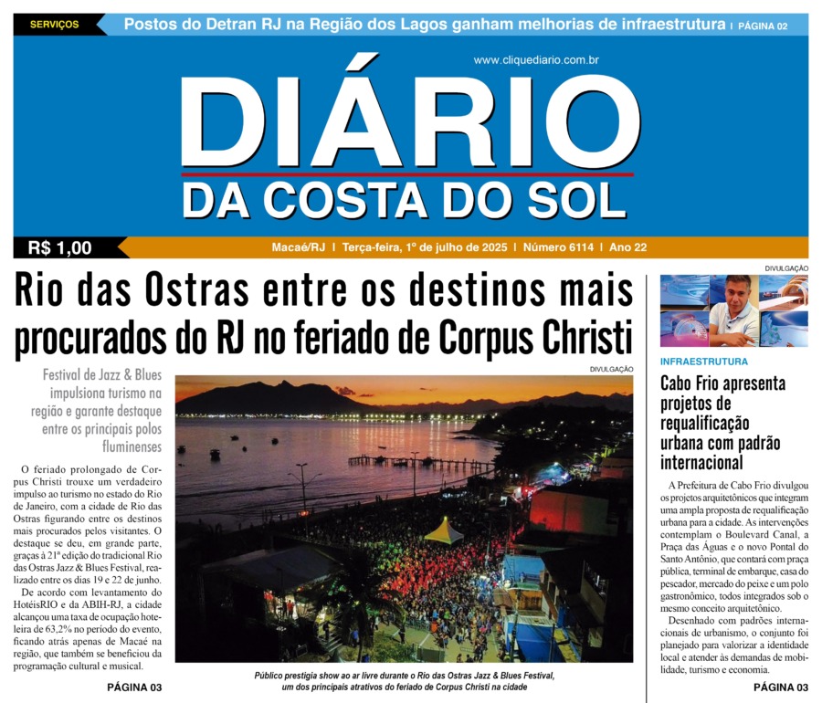 Edições Impressas Edição de terça-feira 01/07/2025 nº 6114 Publicado em 01/07/2025 - 09:00 Escrito por Redação Notícias relacionadas: Seguinte Edição de quarta-feira 02/07/2025 n° 6115 Anterior Edição de sábado a segunda-feira 28 a 30/06/2025 nº 6113 Redação Notícias Recentes Arraial do cabo12 minutos atrás Parceria com a PF fortalece preparo técnico da Segurança Pública de Arraial do Cabo Arraial do cabo15 minutos atrás Iniciativa busca compensar emissões de carbono da frota de Arraial Cidades57 minutos atrás Parceria com o Estado reforça prevenção de enchentes em Rio das Ostras há 39 dias do verão Desenvolvimento1 hora atrás Arteris vence novo leilão da BR-101 e mantém operação da via até 2047 Cidades2 horas atrás Prefeitura de Quissamã abre prazo para solicitação de isenção do IPTU 2026 e 2027 Cabo Frio3 horas atrás Procon Cabo Frio atua com órgãos estaduais em vistoria rigorosa Cabo Frio4 horas atrás Iniciativa de Cabo Frio fortalece conexão entre candidatos e empregadores locais Polícia5 horas atrás Homem acusado de participar de assassinato de pai e filha é preso em Maricá Cidades5 horas atrás Hospital Ferreira Machado vai ganhar novo setor de imunização especializado em Campos Cidades6 horas atrás Mobilidade Urbana vai iniciar cadastramento de veículos para o espetáculo das Águas Dançantes em Macaé Clique Diário E. L. Mídia Editora Ltda CNPJ: 09.298.880/0001-07 Redação: Rua Tupinambás 122 Gloria – Macaé/RJ comercial@diariocs.com (22) 2765-7353 (22) 999253130 Mais lidas da semana Arraial do cabo6 dias atrás Arraial do Cabo celebra 3ª edição do Festival de Frutos do Mar com entrada livre; Carol Biazin, Ramona Rox, Liah Soares e mais Meio Ambiente6 dias atrás Ações do Programa Limpa Rio seguem em vários pontos de Rio das Ostras Cidades6 dias atrás Quissamã participa do lançamento do Programa Ambiente Resiliente, do Governo do Estado Cabo Frio6 dias atrás Música, poesia e memória celebram os 410 anos de Cabo Frio