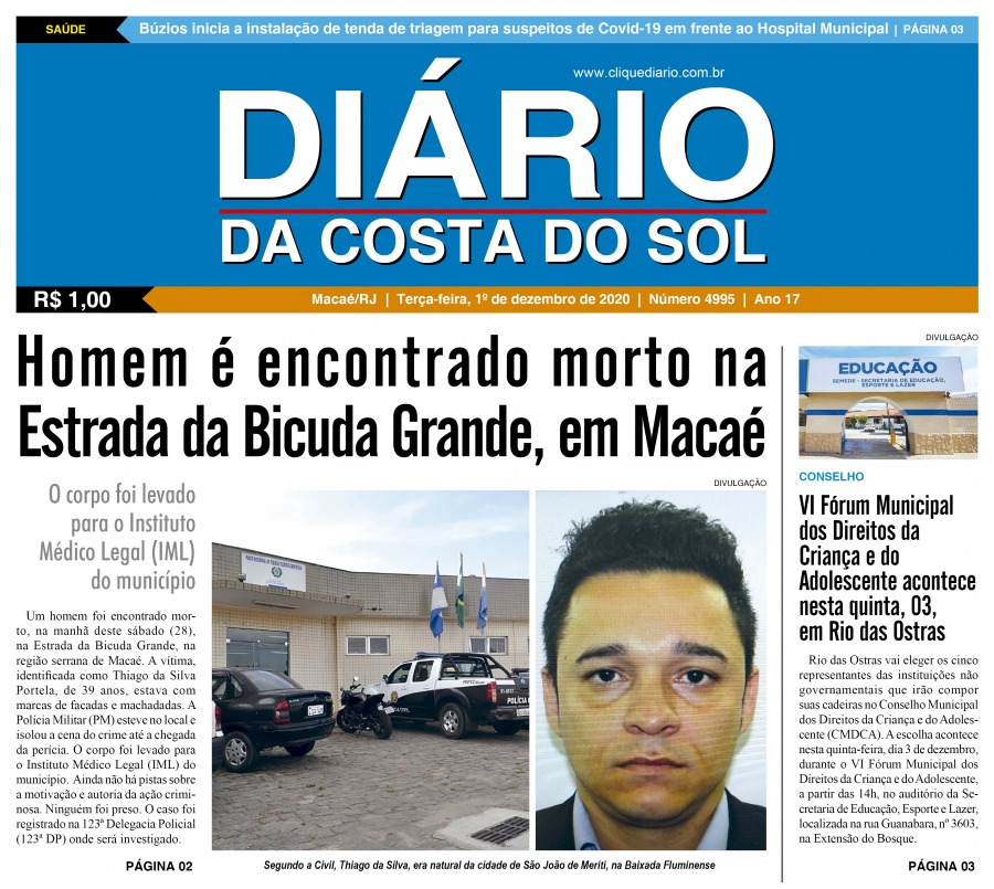 Edições Impressas Edição de terça-feira 01/12/2020 nº 4995 Publicado em 01/12/2020 - 00:40 Escrito por Fernando Vitor Notícias relacionadas:destaque Seguinte Edição de quarta-feira 02/12/2020 nº 4996 Anterior Edição de sábado a segunda-feira 28 a 30_11_2020 nº 4994 Fernando Vitor Notícias Recentes Iguaba13 horas atrás Menina de Iguaba Grande realiza sonho e conhece o príncipe William no Rio de Janeiro Arraial do cabo13 horas atrás Arraial do Cabo é exemplo de tranquilidade na Região dos Lagos, segundo dados do ISP Arraial do cabo13 horas atrás Festival em Arraial do Cabo promete recorde de público com mais de 15 mil pratos e 10 mil litros de chope Arraial do cabo13 horas atrás Oficina une saúde, cidadania e acolhimento em Arraial do Cabo Arraial do cabo14 horas atrás Sucesso de público marca o primeiro dia da Arraial Expo XP Cabo Frio14 horas atrás Prefeitura de Cabo Frio premia autoras com experiências culturais e incentivo à leitura Cidades14 horas atrás Macaé realiza audiência pública do Projeto Macaé +20 no dia 10 de dezembro Polícia15 horas atrás Polícia Militar recupera celulares roubados após série de assaltos em Campos Educação15 horas atrás Mostra cultural do CIEP Mestre Marçal lota o Teatro de Rio das Ostras Polícia15 horas atrás Polícia prende 3 homens envolvidos com o tráfico em Rio das Ostras Clique Diário E. L. Mídia Editora Ltda CNPJ: 09.298.880/0001-07 Redação: Rua Tupinambás 122 Gloria – Macaé/RJ comercial@diariocs.com (22) 2765-7353 (22) 999253130 Mais lidas da semana Arraial do cabo2 dias atrás Arraial do Cabo celebra 3ª edição do Festival de Frutos do Mar com entrada livre; Carol Biazin, Ramona Rox, Liah Soares e mais Cidades4 dias atrás HFM ganha novo Pronto-Socorro moderno e ampliado em Campos Meio Ambiente3 dias atrás Programa do governo estadual promove limpeza de rio no Âncora, em Rio das Ostras Turismo5 dias atrás Saquarema celebra reconhecimento de projeto pelo Ministério do Turismo