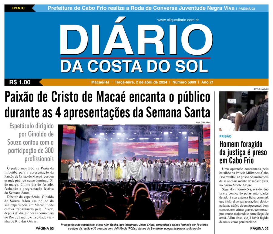 Edições Impressas Edição de terça-feira 02/04/2024 nº 5809 Publicado em 02/04/2024 - 00:00 Escrito por Redação Notícias relacionadas: Seguinte Edição de quarta-feira 03/04/2024 nº 5810 Anterior Edição de sexta a segunda-feira 29/03 a 01/04/2024 nº 5808 Redação Notícias Recentes Cabo Frio4 horas atrás Cabo Frio promove ação do projeto Capoeiragem para registro de documentário Sem categoria6 horas atrás Cabo Frio recebe iniciativa que vai orientar Política Estadual do Empreendedorismo Edições Impressas11 horas atrás Edição de quinta e sexta-feira 20 e 21/11/2025 nº 6216 Armação dos Búzios1 dia atrás Búzios atinge 80% de ocupação no feriado Cabo Frio1 dia atrás Cabo Frio prepara esquema especial de segurança nas praias e áreas de lazer Cabo Frio1 dia atrás Cabo Frio realiza ações de proteção a fauna após aparecimento de animais em bairros Cabo Frio1 dia atrás Cabo Frio reúne especialistas em evento do programa “Vim Cuidar de Você” Desenvolvimento1 dia atrás Rio das Ostras estreita relações com a Rede Petro BC de olho em eventos do setor de energia em 2026 Cabo Frio1 dia atrás Aula-passeio apresenta riqueza cultural e ambiental de Cabo Frio na Fazenda Campos Novos Cabo Frio1 dia atrás Cabo Frio suspende expediente em órgãos públicos nesta sexta Clique Diário E. L. Mídia Editora Ltda CNPJ: 09.298.880/0001-07 Redação: Rua Tupinambás 122 Gloria – Macaé/RJ comercial@diariocs.com (22) 2765-7353 (22) 999253130 Mais lidas da semana Cultura6 dias atrás Adilson Lopes apresenta exposição “Trajetória” em Casimiro de Abreu Cabo Frio4 horas atrás Cabo Frio promove ação do projeto Capoeiragem para registro de documentário Desenvolvimento1 dia atrás Rio das Ostras estreita relações com a Rede Petro BC de olho em eventos do setor de energia em 2026 Cultura1 dia atrás Moda e Prosa Caipira tem sua 6ª edição nessa quinta, 20, em Saquarema