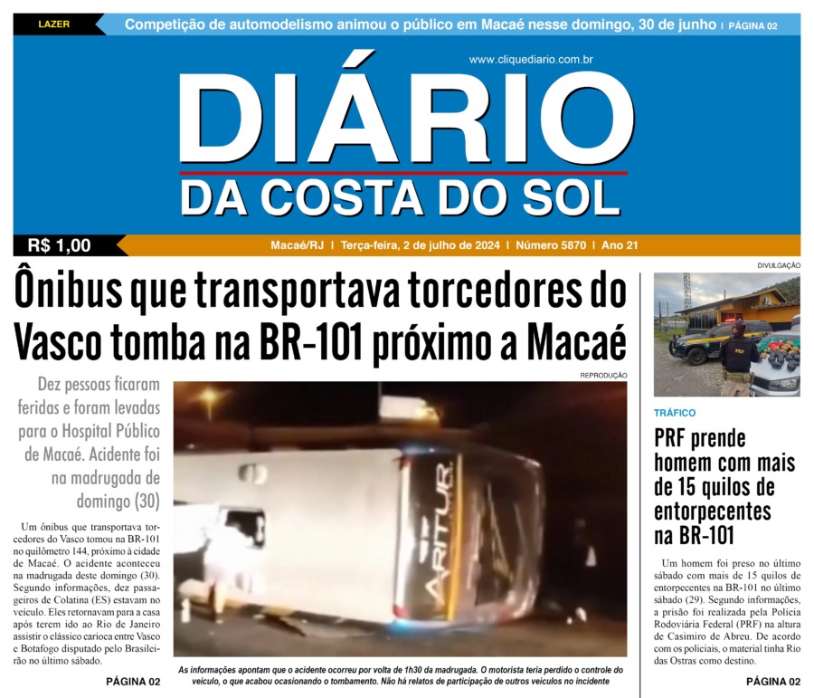 Edições Impressas Edição de terça-feira 02/07/2024 nº 5870 Publicado em 02/07/2024 - 00:00 Escrito por Redação Notícias relacionadas: Seguinte Edição de quarta-feira 03/07/2024 nº 5871 Anterior Edição de sábado a segunda-feira 29/06 a 01/07/2024 nº 5869 Redação Notícias Recentes Comércio17 minutos atrás Plaza Rio das Ostras anuncia chegada do Papai Noel e programação de Natal Polícia51 minutos atrás Ação do GAT do 32º BPM termina com apreensão de drogas e prisão de suspeito na Aroeira, em Macaé Polícia56 minutos atrás Moto roubada é recuperada em Macaé durante ação conjunta entre PM e Mobilidade Urbana Polícia1 hora atrás Polícia Militar apreende fuzil e drogas em operação na comunidade das Malvinas, em Macaé Cidades20 horas atrás Macaé lança o Jornal do Servidor no dia 12 de novembro durante congresso na Câmara Municipal Cidades24 horas atrás Prefeito de Rio das Ostras participa de evento sobre cidades inteligentes em Barcelona, na Espanha Cabo Frio2 dias atrás Estudantes de Cabo Frio brilham em premiação do projeto CaptaAção Meio Ambiente2 dias atrás Cepro promove encontro para discutir avanços e desafios da justiça climática em Rio das Ostras Armação dos Búzios2 dias atrás Búzios Swim celebra esporte, natureza e turismo na Região dos Lagos Cabo Frio2 dias atrás Educação pública de Cabo Frio colhe frutos com conquistas em competições científicas Clique Diário E. L. Mídia Editora Ltda CNPJ: 09.298.880/0001-07 Redação: Rua Tupinambás 122 Gloria – Macaé/RJ comercial@diariocs.com (22) 2765-7353 (22) 999253130 Mais lidas da semana Arraial do cabo4 dias atrás Arraial do Cabo celebra 3ª edição do Festival de Frutos do Mar com entrada livre; Carol Biazin, Ramona Rox, Liah Soares e mais Educação6 dias atrás Estudantes de Rio das Ostras são destaques em evento nacional da Educação Cidades6 dias atrás HFM ganha novo Pronto-Socorro moderno e ampliado em Campos Turismo7 dias atrás Saquarema celebra reconhecimento de projeto pelo Ministério do Turismo