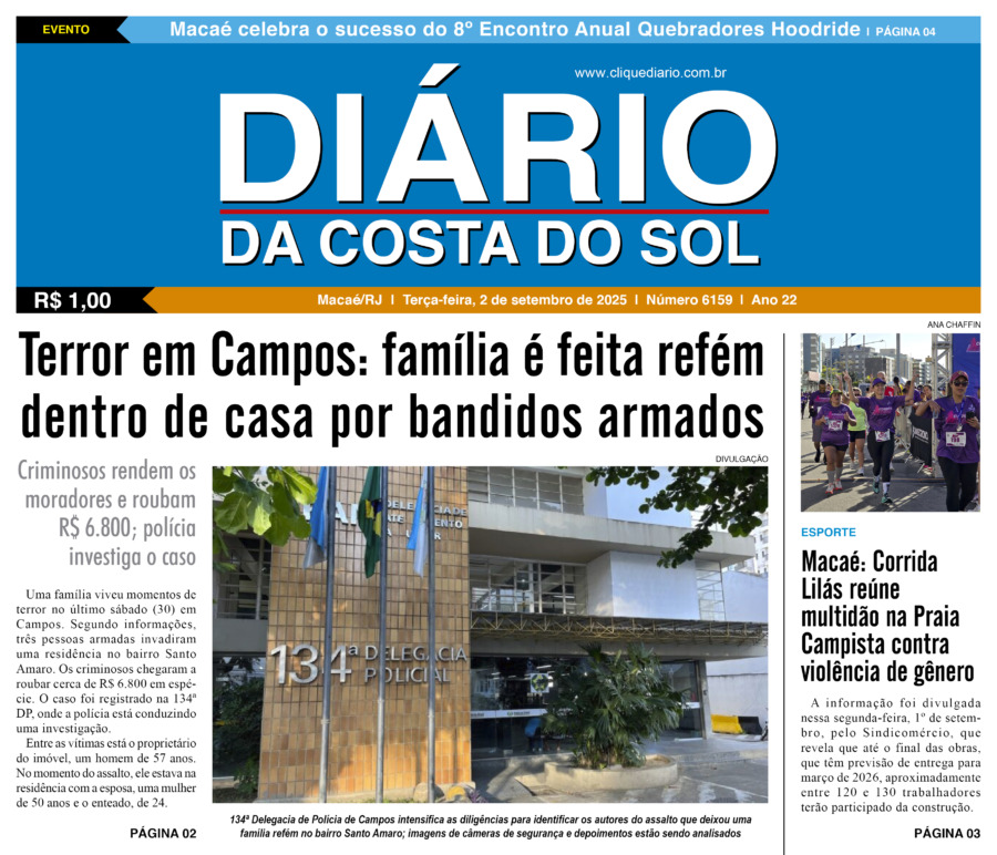 Edições Impressas Edição de terça-feira 02/09/2025 nº 6159 Publicado em 02/09/2025 - 09:07 Escrito por Redação Notícias relacionadas: Seguinte Edição de quarta-feira 03/09/2025 nº 6160 Anterior Edição de sábado a segunda-feira 30/08 a 01/09/2025 nº 6158 Redação Notícias Recentes Cabo Frio18 horas atrás Estudantes de Cabo Frio brilham em premiação do projeto CaptaAção Armação dos Búzios23 horas atrás Búzios Swim celebra esporte, natureza e turismo na Região dos Lagos Cabo Frio1 dia atrás Educação pública de Cabo Frio colhe frutos com conquistas em competições científicas Edições Impressas1 dia atrás Edição de sábado a segunda-feira 08 a 10/11/2025 nº 6208 Polícia1 dia atrás Moto sem placa é abandonada após fuga de suspeito em Macaé Polícia1 dia atrás Polícia Civil prende homem em flagrante por tráfico de drogas no Parque Aeroporto, em Macaé Iguaba2 dias atrás Menina de Iguaba Grande realiza sonho e conhece o príncipe William no Rio de Janeiro Arraial do cabo2 dias atrás Arraial do Cabo é exemplo de tranquilidade na Região dos Lagos, segundo dados do ISP Arraial do cabo2 dias atrás Festival em Arraial do Cabo promete recorde de público com mais de 15 mil pratos e 10 mil litros de chope Arraial do cabo2 dias atrás Oficina une saúde, cidadania e acolhimento em Arraial do Cabo Clique Diário E. L. Mídia Editora Ltda CNPJ: 09.298.880/0001-07 Redação: Rua Tupinambás 122 Gloria – Macaé/RJ comercial@diariocs.com (22) 2765-7353 (22) 999253130 Mais lidas da semana Arraial do cabo3 dias atrás Arraial do Cabo celebra 3ª edição do Festival de Frutos do Mar com entrada livre; Carol Biazin, Ramona Rox, Liah Soares e mais Meio Ambiente4 dias atrás Programa do governo estadual promove limpeza de rio no Âncora, em Rio das Ostras Meio Ambiente3 dias atrás Ações do Programa Limpa Rio seguem em vários pontos de Rio das Ostras Turismo6 dias atrás Saquarema celebra reconhecimento de projeto pelo Ministério do Turismo