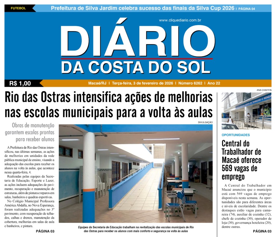 Edições Impressas Edição de terça-feira 03/02/2026 nº 6262 Publicado em 03/02/2026 - 09:37 Escrito por Redação Notícias relacionadas: Anterior Edição de sábado a segunda-feira 31/01 a 02/02/2026 nº 6261 Redação Notícias Recentes Edições Impressas17 minutos atrás Edição de terça-feira 03/02/2026 nº 6262 Iguaba17 horas atrás Iguaba Grande flagra negociação de drogas em patrulhamento policial Cabo Frio17 horas atrás Cabo Frio disponibiliza cadastro on-line para lista de espera da educação Cabo Frio17 horas atrás Cabo Frio executa obra viária na Estradinha com interdições diárias Cidades17 horas atrás Prefeitura flagra despejo irregular de esgoto em supermercado de Rio das Ostras Polícia18 horas atrás Corpo de uma mulher foi encontrado em Travessão, distrito de Campos Educação18 horas atrás Rio das Ostras intensifica ações de melhorias nas escolas para a volta às aulas Polícia20 horas atrás Guarda Municipal prende homem que tentou matar a ex-sogra em Maricá São Pedro da Aldeia20 horas atrás Bairro São João vive tarde de tensão após troca de tiros em São Pedro da Aldeia Cabo Frio20 horas atrás Feira Quilombola movimenta Cabo Frio com edição antecipada Clique Diário E. L. Mídia Editora Ltda CNPJ: 09.298.880/0001-07 Redação: Rua Tupinambás 122 Gloria – Macaé/RJ comercial@diariocs.com (22) 2765-7353 (22) 999253130 Mais lidas da semana Desenvolvimento5 dias atrás Maricá levará projeto de Oscar Niemeyer para feira imobiliária na França Cidades5 dias atrás Macaé amplia vagas na educação infantil com entrega de nova unidade escolar no Trapiche Cidades5 dias atrás Rio das Ostras inicia limpeza e ordenamento da chamada fiação aérea da cidade Sem categoria4 dias atrás NUPEM/URFJ realiza Genomic Week 2026 e reforça Macaé como polo estratégico de ciência e inovação