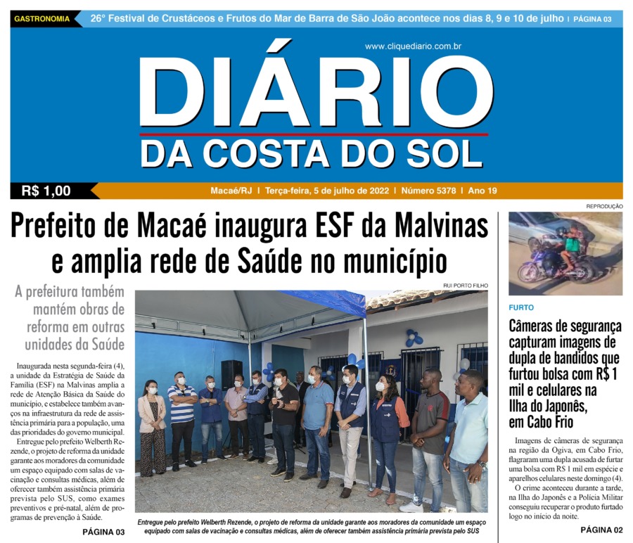 Edições Impressas Edição de terça-feira 05/07/2022 nº 5378 Publicado em 04/07/2022 - 23:55 Escrito por Fernando Vitor Notícias relacionadas: Seguinte Edição de quarta-feira 06/07/2022 nº 5379 Anterior Edição de sábado a segunda-feira 02 a 04/07/2022 nº 5377 Fernando Vitor Notícias Recentes Arraial do cabo9 horas atrás Educação de Arraial do Cabo orienta responsáveis sobre rematrícula para o próximo ano Cabo Frio9 horas atrás Evento comercial mais aguardado de Cabo Frio atinge 100% de estandes vendidos Saúde10 horas atrás Rio das Ostras comemora melhorias no atendimento da saúde municipal Cabo Frio10 horas atrás Nova exposição no Palácio das Águias recebe homenagem da cultura negra em Cabo Frio com 44 obras Arraial do cabo10 horas atrás A FIPAC em Arraial do Cabo alerta operadores náuticos: regularizem suas embarcações Comércio10 horas atrás Sindicomércio anuncia abertura do Natal Sesc 2025 em Rio das Ostras e Casimiro de Abreu Polícia11 horas atrás Polícia apreende drogas no Lagomar após varredura motivada por denúncia Polícia11 horas atrás Operação do GAT do 32º BPM apreende drogas, dinheiro e moto sem placa na Favela da Linha Desenvolvimento12 horas atrás Silva Jardim realiza audiência pública de revisão do seu Plano de Saneamento Básico Arraial do cabo13 horas atrás O poder da natureza e da memória em telas na mostra de Fransciscone Araújo em Arraial do Cabo Clique Diário E. L. Mídia Editora Ltda CNPJ: 09.298.880/0001-07 Redação: Rua Tupinambás 122 Gloria – Macaé/RJ comercial@diariocs.com (22) 2765-7353 (22) 999253130 Mais lidas da semana Cultura5 dias atrás Adilson Lopes apresenta exposição “Trajetória” em Casimiro de Abreu Polícia7 dias atrás Farmácia é interditada e uma pessoa é presa em Rio das Ostras em operação da Polícia Federal Meio Ambiente1 dia atrás Lagoa de Iriry, em Rio das Ostras, recebe nova sinalização focada em sustentabilidade Cidades1 dia atrás Macaé registra avanço na coleta seletiva porta a porta e recolhe mais de 2 toneladas em 45 dias