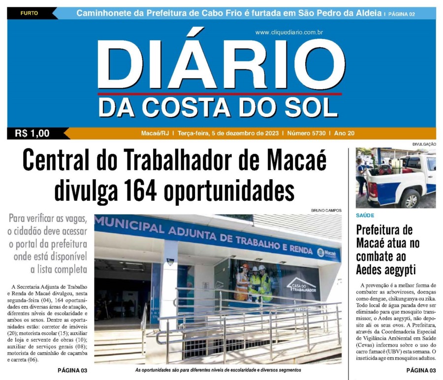 Edições Impressas Edição de terça-feira 05/12/2023 nº 5730 Publicado em 05/12/2023 - 00:00 Escrito por Redação Notícias relacionadas: Seguinte Edição de quarta-feira 06/12/2023 nº 5731 Anterior Edição de sábado a segunda-feira 02 a 04/12/2023 nº 5729 Redação Notícias Recentes Cidades4 minutos atrás Macaé marca presença na OTC Brasil e reforça papel estratégico no setor de energia Saúde16 minutos atrás Unidade de Saúde do Adolescente de Rio das Ostras comemora 20 anos com várias atividades Cultura18 horas atrás Rio das Ostras tem 2 cineclubes selecionados para 2ª Mostra Mercosul Audiovisual Cidades18 horas atrás Câmara de Macaé debate aumento de acidentes e propõe Semana de Prevenção a Acidentes com Motociclistas Arraial do cabo18 horas atrás Instituto de Previdência de Arraial do Cabo aplica provas objetivas neste domingo (2) Cidades18 horas atrás Quissamã é destaque nacional ao integrar rede de inovação em Atenção Primária à Saúde da Fiocruz Cabo Frio18 horas atrás Cabo Frio inicia obra de reestruturação na Praça São Benedito para melhorar mobilidade e segurança Cabo Frio18 horas atrás Obra na Rua dos Biquínis marca nova fase de valorização dos espaços públicos em Cabo Frio Polícia19 horas atrás Mulher é morta a tiros enquanto carregava bebê no colo em Campos Armação dos Búzios19 horas atrás Búzios sedia Encontro Fluminense FBHA com foco no fortalecimento do turismo regional Clique Diário E. L. Mídia Editora Ltda CNPJ: 09.298.880/0001-07 Redação: Rua Tupinambás 122 Gloria – Macaé/RJ comercial@diariocs.com (22) 2765-7353 (22) 999253130 Mais lidas da semana Edições Impressas4 dias atrás Edição de sábado a segunda-feira 25 a 27/10/2025 nº 6198 Cidades5 dias atrás Macaé Cup vai agitar a serra com o maior torneio de futebol infantil da região Edições Impressas5 dias atrás Edição de sexta-feira 24/10/2025 nº 6197 Cidadania5 dias atrás Plano Diretor de Rio das Ostras é tema de fórum da sociedade civil nesse sábado, 25