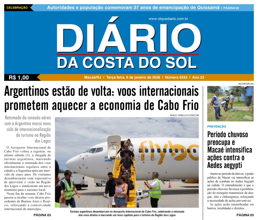 Edições Impressas Edição de terça-feira 06/01/2026 nº 6242 Publicado em 06/01/2026 - 10:11 Escrito por Redação Notícias relacionadas: Anterior Edição de quarta a segunda-feira 31/12 a 05/01/2026 nº 6241 Redação Notícias Recentes Armação dos Búzios3 horas atrás Alta temporada leva Búzios a operar com população dez vezes maior Mobilidade4 horas atrás Ações de fiscalização deixam Rio das Ostras mais segura na virada de ano Cidades4 horas atrás Macaé decide prorrogar vacinação contra o HPV para jovens de 15 a 19 anos Arraial do cabo5 horas atrás Arraial do Cabo divulga prazos e descontos do IPTU 2026 Cidades5 horas atrás Acidente na RJ-216 deixa duas mulheres em estado grave em Campos Arraial do cabo5 horas atrás Salas híbridas modernizam ensino na rede pública de Arraial do Cabo Arraial do cabo5 horas atrás Forças integradas ampliam fiscalização e ordenamento em Arraial do Cabo Polícia5 horas atrás PM apreende quase 1 kg de cocaína após denúncia anônima em Macaé Segurança Pública6 horas atrás Maricá divulga balanço de operação especial de segurança na virada de ano Arraial do cabo6 horas atrás Consumidores de Arraial do Cabo terão atendimento especial da Enel após quedas de luz Clique Diário E. L. Mídia Editora Ltda CNPJ: 09.298.880/0001-07 Redação: Rua Tupinambás 122 Gloria – Macaé/RJ comercial@diariocs.com (22) 2765-7353 (22) 999253130 Mais lidas da semana Arraial do cabo6 dias atrás Arraial do Cabo alerta para efeitos graves do calor excessivo Segurança Pública6 horas atrás Maricá divulga balanço de operação especial de segurança na virada de ano Cidades1 dia atrás Macaé intensifica ações de combate ao Aedes aegypti durante período chuvoso Cidades9 horas atrás Procon de Rio das Ostras volta a pressionar Enel por melhorias nos serviços