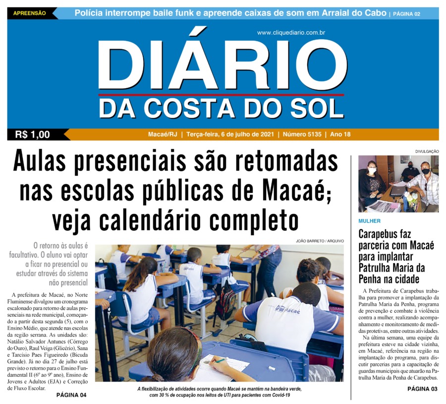 Edições Impressas Edição de terça-feira 06/07/2021 n° 5135 Publicado em 06/07/2021 - 06:22 Escrito por Fernando Vitor Notícias relacionadas: Seguinte Edição de quarta-feira 07/07/2021 n° 5136 Anterior Edição de sábado a segunda-feira 03 a 05/07/2021 nº 5134 Fernando Vitor Notícias Recentes Cabo Frio18 horas atrás Cabo Frio antecipa a Black Friday com grandes marcas e atrações musicais Cidades21 horas atrás Procon de Rio das Ostras investiga denúncias de cobrança dupla na Enel Cidades24 horas atrás Macaé sediará o 8º Encontro Fluminense de Arborização Urbana em dezembro Cultura2 dias atrás Teatro de Rio das Ostras recebe 2 espetáculos de dança nesse fim de semana Arraial do cabo2 dias atrás FIPAC oferece serviços de saúde e prevenção ao câncer de próstata em Arraial do Cabo Arraial do cabo2 dias atrás Resultado preliminar do concurso de Arraial já está no ar pelo IBAM Edições Impressas2 dias atrás Edição de sábado a segunda-feira 15 a 17/11/2025 nº 6213 Cidades2 dias atrás Shopping Plaza Macaé inicia programação de Natal neste fim de semana Cabo Frio2 dias atrás Disputa em dobro marca encerramento em Cabo Frio do circuito de surf Cabo Frio3 dias atrás Agentes de Cabo Frio recebem novo treinamento técnico para atuar em casos de poluição sonora Clique Diário E. L. Mídia Editora Ltda CNPJ: 09.298.880/0001-07 Redação: Rua Tupinambás 122 Gloria – Macaé/RJ comercial@diariocs.com (22) 2765-7353 (22) 999253130 Mais lidas da semana Cultura3 dias atrás Adilson Lopes apresenta exposição “Trajetória” em Casimiro de Abreu Cidades6 dias atrás Servidores de Rio das Ostras participam de treinamento do Estado em Búzios Polícia5 dias atrás Farmácia é interditada e uma pessoa é presa em Rio das Ostras em operação da Polícia Federal Esporte3 dias atrás De Saquarema para o Brasileirão: Vasco troca gramado de São Januário