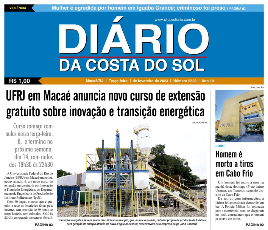 Edições Impressas Edição de terça-feira 07/02/2023 nº 5528 Publicado em 06/02/2023 - 23:55 Escrito por Redação Notícias relacionadas: Seguinte Edição de quarta-feira 08/02/2023 nº 5529 Anterior Edição de sábado a segunda-feira 04 a 06/02/2023 nº 5527 Redação Notícias Recentes Cabo Frio4 horas atrás Ação conjunta em Cabo Frio testa resposta rápida a incêndio em embarcação Cabo Frio5 horas atrás Bombeiros socorrem vítimas de colisão entre carro e motocicleta em Cabo Frio Cabo Frio5 horas atrás Cabo Frio reforça importância da prevenção com evento especial para servidoras da Comsercaf Polícia5 horas atrás Polícia Civil e Rio+ promovem operação contra furto de água em Rio das Ostras Arraial do cabo5 horas atrás Prefeitura de Arraial atualiza cadastro de famílias em área de preservação no Caiçara Arraial do cabo5 horas atrás Vistoria do Ipem facilita regularização de taxistas em Arraial do Cabo Cabo Frio5 horas atrás Biblioteca de Cabo Frio promove celebração artística e literária em homenagem aos poetas Cabo Frio5 horas atrás Canoa havaiana leva mensagem de coragem e prevenção pelo Canal do Itajuru, Cabo Frio Cabo Frio5 horas atrás Sede da Guarda Municipal de Cabo Frio vira espaço de acolhimento e saúde para mulheres Polícia6 horas atrás 32º BPM realizou 12 prisões em cidades da região em 24 horas Clique Diário E. L. Mídia Editora Ltda CNPJ: 09.298.880/0001-07 Redação: Rua Tupinambás 122 Gloria – Macaé/RJ comercial@diariocs.com (22) 2765-7353 (22) 999253130 Mais lidas da semana Cultura2 dias atrás Silva Jardim anuncia shows gratuitos de samba e pagode para o fim de semana Edições Impressas5 dias atrás Edição de sexta-feira 17/10/2025 nº 6192 Cultura1 dia atrás Música, emoção e cores: Rodrigo Pontes apresenta show especial em Rio das Ostras Polícia2 dias atrás Policiais da PRF salvam bebê engasgado na BR-101, em Campos