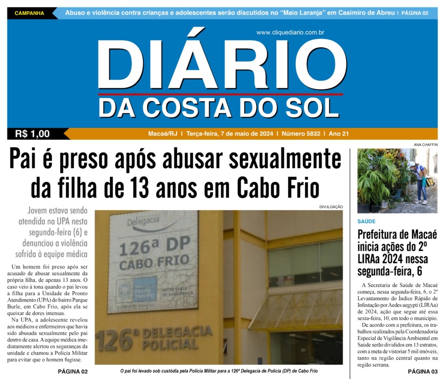Edições Impressas Edição de terça-feira 07/05/2024 nº 5832 Publicado em 06/05/2024 - 23:55 Escrito por Redação Notícias relacionadas: Seguinte Edição de quarta-feira 08/05/2024 nº 5833 Anterior Edição de sábado a segunda-feira 04 a 06/05/2024 nº 5831 Redação Notícias Recentes Cultura3 horas atrás Rio das Ostras tem 2 cineclubes selecionados para 2ª Mostra Mercosul Audiovisual Cidades3 horas atrás Câmara de Macaé debate aumento de acidentes e propõe Semana de Prevenção a Acidentes com Motociclistas Arraial do cabo4 horas atrás Instituto de Previdência de Arraial do Cabo aplica provas objetivas neste domingo (2) Cidades4 horas atrás Quissamã é destaque nacional ao integrar rede de inovação em Atenção Primária à Saúde da Fiocruz Cabo Frio4 horas atrás Cabo Frio inicia obra de reestruturação na Praça São Benedito para melhorar mobilidade e segurança Cabo Frio4 horas atrás Obra na Rua dos Biquínis marca nova fase de valorização dos espaços públicos em Cabo Frio Polícia4 horas atrás Mulher é morta a tiros enquanto carregava bebê no colo em Campos Armação dos Búzios4 horas atrás Búzios sedia Encontro Fluminense FBHA com foco no fortalecimento do turismo regional Cultura5 horas atrás Festival de Frutos do Mar de Rio das Ostras é lançado em evento para convidados Mobilidade5 horas atrás Acidente assusta moradores e deixa RJ-106 interditada em Saquarema Clique Diário E. L. Mídia Editora Ltda CNPJ: 09.298.880/0001-07 Redação: Rua Tupinambás 122 Gloria – Macaé/RJ comercial@diariocs.com (22) 2765-7353 (22) 999253130 Mais lidas da semana Edições Impressas3 dias atrás Edição de sábado a segunda-feira 25 a 27/10/2025 nº 6198 Edições Impressas7 dias atrás Edição de quarta-feira 22/10/2025 nº 6195 Cabo Frio6 horas atrás Audiência pública discute receitas e despesas previstas para Cabo Frio no próximo ano Edições Impressas5 dias atrás Edição de quinta-feira 23/10/2025 nº 6196