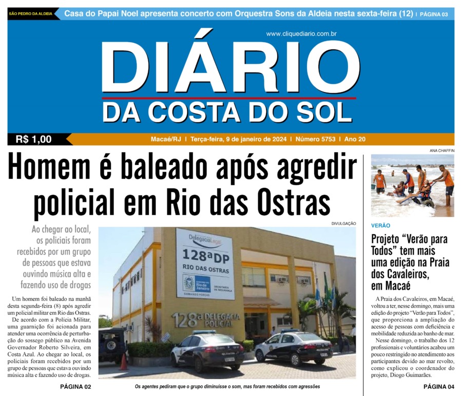 Edições Impressas Edição de terça-feira 09/01/2024 nº 5753 Publicado em 09/01/2024 - 00:00 Escrito por Redação Notícias relacionadas: Seguinte Edição de quarta-feira 10/01/2024 nº 5754 Anterior Edição de sábado a segunda-feira 06 a 08/01/2024 nº 5752 Redação Notícias Recentes Cidades3 horas atrás Macaé sediará o 8º Encontro Fluminense de Arborização Urbana em dezembro Cultura1 dia atrás Teatro de Rio das Ostras recebe 2 espetáculos de dança nesse fim de semana Arraial do cabo1 dia atrás FIPAC oferece serviços de saúde e prevenção ao câncer de próstata em Arraial do Cabo Arraial do cabo1 dia atrás Resultado preliminar do concurso de Arraial já está no ar pelo IBAM Edições Impressas1 dia atrás Edição de sábado a segunda-feira 15 a 17/11/2025 nº 6213 Cidades1 dia atrás Shopping Plaza Macaé inicia programação de Natal neste fim de semana Cabo Frio1 dia atrás Disputa em dobro marca encerramento em Cabo Frio do circuito de surf Cabo Frio2 dias atrás Agentes de Cabo Frio recebem novo treinamento técnico para atuar em casos de poluição sonora Cabo Frio2 dias atrás Homem procurado por latrocínio é detido por agentes em Cabo Frio Cabo Frio2 dias atrás Representante da Guarda Civil de Cabo Frio compete na etapa final ao lado de jovens atletas Clique Diário E. L. Mídia Editora Ltda CNPJ: 09.298.880/0001-07 Redação: Rua Tupinambás 122 Gloria – Macaé/RJ comercial@diariocs.com (22) 2765-7353 (22) 999253130 Mais lidas da semana Cultura2 dias atrás Adilson Lopes apresenta exposição “Trajetória” em Casimiro de Abreu Cidades5 dias atrás Servidores de Rio das Ostras participam de treinamento do Estado em Búzios Polícia4 dias atrás Farmácia é interditada e uma pessoa é presa em Rio das Ostras em operação da Polícia Federal Esporte2 dias atrás De Saquarema para o Brasileirão: Vasco troca gramado de São Januário