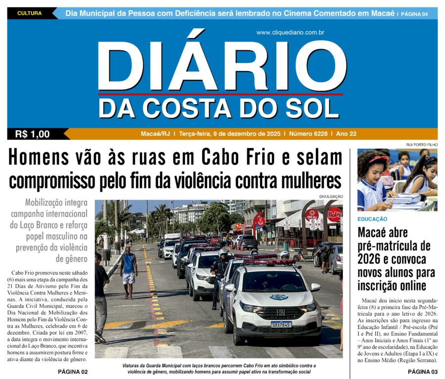 Edições Impressas Edição de terça-feira 09/12/2025 nº 6228 Publicado em 09/12/2025 - 09:23 Escrito por Redação Notícias relacionadas: Anterior Edição de sábado a segunda-feira 06 a 08/12/2025 nº 6227 Redação Notícias Recentes Cidades11 minutos atrás Mulher de 24 anos é internada em estado grave após agressão em Campos Cidades25 minutos atrás Quissamã conquista terceiro lugar no Circuito Litorâneo de Futsal Cidades42 minutos atrás Feira de Oportunidades chega a Macaé com empregos, estágios e orientação profissional Cidades57 minutos atrás Macaé oferece 413 vagas de emprego em diversos setores nesta semana Edições Impressas2 horas atrás Edição de terça-feira 09/12/2025 nº 6228 Polícia18 horas atrás Homem é encontrado morto a tiros em Travessão, em Campos Cabo Frio19 horas atrás Cabo Frio tem nova ação de proteção à mulher após denúncia de agressão Cidades19 horas atrás Macaé inicia primeira fase da pré-matrícula para o ano letivo de 2026 Cabo Frio19 horas atrás Cabo Frio lança etapa final do programa de perdão fiscal solidário Cabo Frio19 horas atrás Cabo Frio promove ato simbólico dos homens pelo fim da violência Clique Diário E. L. Mídia Editora Ltda CNPJ: 09.298.880/0001-07 Redação: Rua Tupinambás 122 Gloria – Macaé/RJ comercial@diariocs.com (22) 2765-7353 (22) 999253130 Mais lidas da semana Cabo Frio2 dias atrás Cabo Frio oferece cursos gratuitos para fortalecer o empreendedorismo feminino em Tamoios Arraial do cabo2 dias atrás Ex-secretário de Arraial do Cabo é preso em operação da Polícia Civil de Búzios Polícia1 dia atrás Moto com chassi adulterado é apreendida pela PM na Nova Holanda, em Macaé Cidades2 dias atrás Serviços essenciais seguem ativos em Rio das Ostras durante feriado de segunda-feira