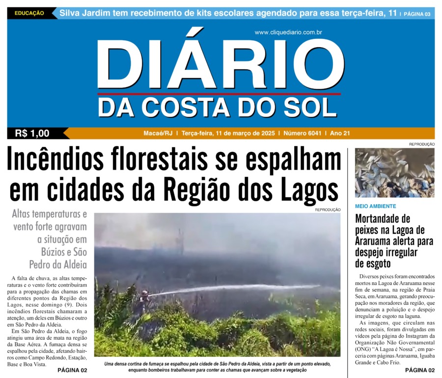 Edições Impressas Edição de terça-feira 11/03/2025 nº 6041 Publicado em 11/03/2025 - 08:09 Escrito por Redação Notícias relacionadas: Seguinte Edição de quarta-feira 12/03/2025 nº 6042 Anterior Edição de sábado a segunda-feira 08 a 10/03/2025 nº 6040 Redação Notícias Recentes Saúde5 horas atrás Rio das Ostras ultrapassa marca dos 13,5 mil pets vacinados em campanha contra a raiva Cidades5 horas atrás Procon apreende bebidas em depósito no bairro São José do Barreto, em Macaé Araruama5 horas atrás Prefeitura de Araruama apresenta detalhes da Expo 2025 e reforça operação de segurança e trânsito Arraial do cabo5 horas atrás Secretaria de Mobilidade Urbana de Arraial participa de congresso nacional em São Paulo Polícia5 horas atrás Polícia Militar recupera Fiat Toro abndonado às margens da Linha Azul, em Macaé Arraial do cabo5 horas atrás Conselho Municipal de Arraial promove encontro sobre políticas de proteção animal Cabo Frio5 horas atrás Cabo Frio amplia medidas de preservação com novas placas e plantio de espécies nativas Cidades6 horas atrás Carapebus conclui curso técnico para agentes de saúde e de endemias Comércio6 horas atrás Plaza Rio das Ostras ganha 7 novas lojas em outubro e já prepara mais uma inauguração Educação7 horas atrás Saquarema atualiza situação de obras de nova creche no bairro Palmital Clique Diário E. L. Mídia Editora Ltda CNPJ: 09.298.880/0001-07 Redação: Rua Tupinambás 122 Gloria – Macaé/RJ comercial@diariocs.com (22) 2765-7353 (22) 999253130 Mais lidas da semana Edições Impressas5 dias atrás Edição de sábado a segunda-feira 25 a 27/10/2025 nº 6198 Cultura1 dia atrás Prédio da Onda, em Rio das Ostras, recebe oficina teatral gratuita a partir dessa quinta, 30 Cultura6 dias atrás Teatro de Rio das Ostras tem fim de semana com 2 espetáculos locais Edições Impressas6 dias atrás Edição de sexta-feira 24/10/2025 nº 6197