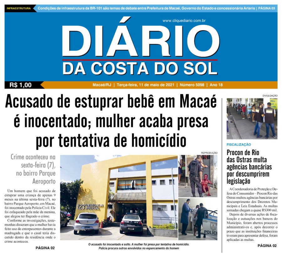 Edições Impressas Edição de terça-feira 11/05/2021 nº 5098 Publicado em 11/05/2021 - 04:11 Escrito por Fernando Vitor Notícias relacionadas:destaque Seguinte Edição de quarta-feira 12/05/2021 nº 5099 Anterior Edição de sábado a segunda-feira 08 a 10/05/2021 nº 5097 Fernando Vitor Notícias Recentes Cultura25 minutos atrás Adilson Lopes apresenta exposição “Trajetória” em Casimiro de Abreu Cidades25 minutos atrás Prefeito reforça potencial econômico de Macaé em debate sobre avanços de voos comerciais Polícia45 minutos atrás Macaé registra menor número de roubos de rua da história em outubro Polícia55 minutos atrás Três membros de facção criminosa foram presos em Macaé durante operação da Polícia Civil Edições Impressas58 minutos atrás Edição de sexta-feira 14/11/2025 nº 6212 Cidades18 horas atrás Macaé discute armamento da Guarda Municipal como parte de ações para fortalecer a segurança pública Araruama18 horas atrás Presos em Araruama tinham mandados por roubo e associação criminosa Educação18 horas atrás Inscrição para vagas nas creches de Rio das Ostras em 2026 termina nessa sexta, 14 Cabo Frio18 horas atrás Cabo Frio executa nova etapa de sinalização horizontal na cidade Cidades18 horas atrás Agricultores e pecuaristas de Quissamã participam de encontro de capacitação e orientação técnica Clique Diário E. L. Mídia Editora Ltda CNPJ: 09.298.880/0001-07 Redação: Rua Tupinambás 122 Gloria – Macaé/RJ comercial@diariocs.com (22) 2765-7353 (22) 999253130 Mais lidas da semana Polícia2 dias atrás Farmácia é interditada e uma pessoa é presa em Rio das Ostras em operação da Polícia Federal Cidades3 dias atrás Servidores de Rio das Ostras participam de treinamento do Estado em Búzios Cabo Frio7 dias atrás Prefeitura de Cabo Frio premia autoras com experiências culturais e incentivo à leitura Cidades2 dias atrás Vereadores de Macaé vão embarcar nesta quinta para participar da COP 30 em Belém