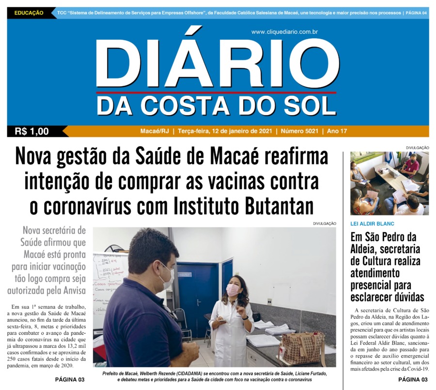 Edições Impressas Edição de terça-feira 12/01/2021 nº 5021 Publicado em 12/01/2021 - 00:00 Escrito por Fernando Vitor Notícias relacionadas:destaque Seguinte Edição de quarta-feira 13/01/2021 nº 5022 Anterior Edição de sábado a segunda-feira 09 a 11/01/2021 nº 5020 Fernando Vitor Notícias Recentes Cabo Frio4 horas atrás Polícia investiga ataque armado ocorrido em via rural de Cabo Frio Arraial do cabo4 horas atrás Gastronomia, música e chopp artesanal agitam a Praia Grande em Arraial do Cabo Cabo Frio4 horas atrás Convento Nossa Senhora dos Anjos em Cabo Frio recebe última edição do ‘Nosso Samba’ em 2025 Cabo Frio4 horas atrás Maracatu do Tambor de Cumba movimenta Cabo Frio no Novembro Negro em Museu Charitas Cabo Frio4 horas atrás Mobilização nacional une Cabo Frio no enfrentamento à dengue Cabo Frio4 horas atrás Educação ambiental de Cabo Frio ganha destaque com placas informativas na orla Educação5 horas atrás Rio das Ostras abre inscrições para vagas em creches municipais para 2026 Cidades5 horas atrás Quissamã abre pré-matrículas para o ano letivo de 2026 nesta terça-feira (11) Cidades5 horas atrás Procon Macaé emite alerta para consumidores durante a Black Friday Polícia6 horas atrás Homem é preso em Campos acusado de abusar de criança de 5 anos Clique Diário E. L. Mídia Editora Ltda CNPJ: 09.298.880/0001-07 Redação: Rua Tupinambás 122 Gloria – Macaé/RJ comercial@diariocs.com (22) 2765-7353 (22) 999253130 Mais lidas da semana Arraial do cabo4 dias atrás Arraial do Cabo celebra 3ª edição do Festival de Frutos do Mar com entrada livre; Carol Biazin, Ramona Rox, Liah Soares e mais Cidades6 dias atrás HFM ganha novo Pronto-Socorro moderno e ampliado em Campos Meio Ambiente4 dias atrás Ações do Programa Limpa Rio seguem em vários pontos de Rio das Ostras Meio Ambiente5 dias atrás Programa do governo estadual promove limpeza de rio no Âncora, em Rio das Ostras