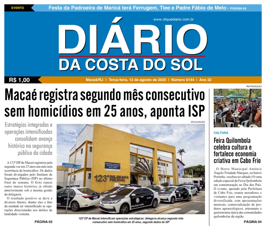 Edições Impressas Edição de terça-feira 12/08/2025 nº 6144 Publicado em 12/08/2025 - 08:57 Escrito por Redação Notícias relacionadas: Seguinte Edição de quarta-feira 13/08/2025 nº 6145 Anterior Edição de sábado a segunda-feira 09 a 11/08/2025 nº 6143 Redação Notícias Recentes Cidades24 minutos atrás Casa do Educador de Saquarema recebe audiência pública nessa quarta, 12 Polícia1 hora atrás Equipe da Guarda de Cabo Frio recupera pertences levados de carro estacionado Educação2 horas atrás Basquete, queimado, dama e xadrez marcam em Cabo Frio o fim dos Jogos Estudantis Municipais Emprego3 horas atrás Prefeitura de Cabo Frio investe em qualificação e sustentabilidade Polícia4 horas atrás Adolescente é detida em Maricá em ação que apreendeu grande quantidade de drogas Polícia4 horas atrás Polícia apreende drogas em caixa de energia de casa em Rio das Ostras Comércio5 horas atrás Plaza Rio das Ostras anuncia chegada do Papai Noel e programação de Natal Polícia5 horas atrás Ação do GAT do 32º BPM termina com apreensão de drogas e prisão de suspeito na Aroeira, em Macaé Polícia5 horas atrás Moto roubada é recuperada em Macaé durante ação conjunta entre PM e Mobilidade Urbana Polícia5 horas atrás Polícia Militar apreende fuzil e drogas em operação na comunidade das Malvinas, em Macaé Clique Diário E. L. Mídia Editora Ltda CNPJ: 09.298.880/0001-07 Redação: Rua Tupinambás 122 Gloria – Macaé/RJ comercial@diariocs.com (22) 2765-7353 (22) 999253130 Mais lidas da semana Arraial do cabo4 dias atrás Arraial do Cabo celebra 3ª edição do Festival de Frutos do Mar com entrada livre; Carol Biazin, Ramona Rox, Liah Soares e mais Turismo7 dias atrás Saquarema celebra reconhecimento de projeto pelo Ministério do Turismo Educação6 dias atrás Estudantes de Rio das Ostras são destaques em evento nacional da Educação Cidades6 dias atrás HFM ganha novo Pronto-Socorro moderno e ampliado em Campos