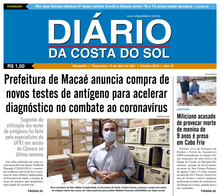 Edições Impressas Edição de terça-feira 13/04/2021 nº 5079 Publicado em 13/04/2021 - 09:54 Escrito por Fernando Vitor Notícias relacionadas:destaque Seguinte Edição de quarta-feira 14/04/2021 nº 5080 Anterior Edição de sábado a segunda-feira 10 a 12/04/2021 nº 5078 Fernando Vitor Notícias Recentes Cidades4 horas atrás Macaé discute armamento da Guarda Municipal como parte de ações para fortalecer a segurança pública Araruama4 horas atrás Presos em Araruama tinham mandados por roubo e associação criminosa Educação4 horas atrás Inscrição para vagas nas creches de Rio das Ostras em 2026 termina nessa sexta, 14 Cabo Frio4 horas atrás Cabo Frio executa nova etapa de sinalização horizontal na cidade Cidades4 horas atrás Agricultores e pecuaristas de Quissamã participam de encontro de capacitação e orientação técnica Arraial do cabo4 horas atrás Nova licença digital promete mais agilidade e transparência em Arraial do Cabo Polícia5 horas atrás Idoso é assassinado a tiros às margens da BR-101, em Campos Esporte5 horas atrás Atletas de Rio das Ostras e Saquarema conquistam título de brasileiro de bodyboarding Arraial do cabo5 horas atrás Sucesso de vendas faz pratos especiais continuarem até o fim de novembro em Arraial no Festival de Frutos do Mar Cabo Frio5 horas atrás Iniciativa reforça compromisso com a identidade cultural cabo-friense Clique Diário E. L. Mídia Editora Ltda CNPJ: 09.298.880/0001-07 Redação: Rua Tupinambás 122 Gloria – Macaé/RJ comercial@diariocs.com (22) 2765-7353 (22) 999253130 Mais lidas da semana Cidades2 dias atrás Servidores de Rio das Ostras participam de treinamento do Estado em Búzios Polícia1 dia atrás Farmácia é interditada e uma pessoa é presa em Rio das Ostras em operação da Polícia Federal Polícia6 dias atrás Polícia prende 3 homens envolvidos com o tráfico em Rio das Ostras Cidades1 dia atrás Vereadores de Macaé vão embarcar nesta quinta para participar da COP 30 em Belém
