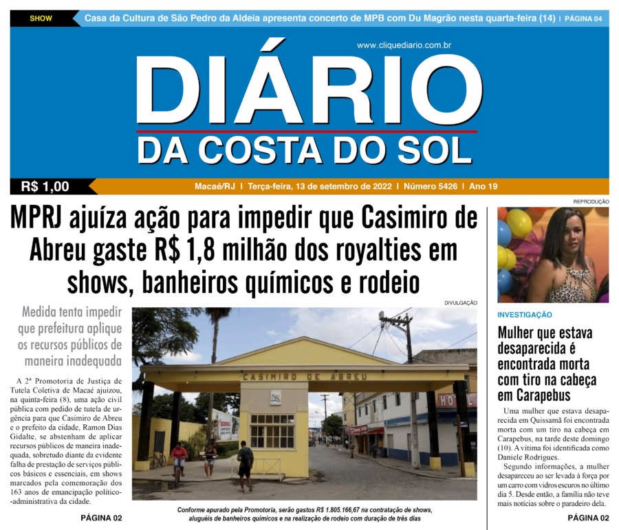 Edições Impressas Edição de terça-feira 13/09/2022 nº 5426 Publicado em 13/09/2022 - 01:49 Escrito por Fernando Vitor Notícias relacionadas: Seguinte Edição de quarta-feira 14/09/2022 nº 5427 Anterior Edição de sábado a segunda-feira 10 a 12/09/2022 nº 5425 Fernando Vitor Notícias Recentes Cultura37 minutos atrás Moda e Prosa Caipira tem sua 6ª edição nessa quinta, 20, em Saquarema Comércio2 horas atrás Rio das Ostras tem 19ª edição de sua tradicional feira outlet nesse feriado Cidades2 horas atrás Macaé recebe 20ª edição do Prefeitura Presente no dia 25 de novembro Polícia3 horas atrás Denúncia anônima leva à prisão de duas mulheres por tráfico em Macaé Cidades3 horas atrás Caravana de Natal Coca-Cola passa por Rio das Ostras e Casimiro de Abreu nessa quinta, 20 Edições Impressas5 horas atrás Edição de quarta-feira 19/11/2025 nº 6215 Arraial do cabo20 horas atrás Educação de Arraial do Cabo orienta responsáveis sobre rematrícula para o próximo ano Cabo Frio20 horas atrás Evento comercial mais aguardado de Cabo Frio atinge 100% de estandes vendidos Saúde21 horas atrás Rio das Ostras comemora melhorias no atendimento da saúde municipal Cabo Frio21 horas atrás Nova exposição no Palácio das Águias recebe homenagem da cultura negra em Cabo Frio com 44 obras Clique Diário E. L. Mídia Editora Ltda CNPJ: 09.298.880/0001-07 Redação: Rua Tupinambás 122 Gloria – Macaé/RJ comercial@diariocs.com (22) 2765-7353 (22) 999253130 Mais lidas da semana Cultura5 dias atrás Adilson Lopes apresenta exposição “Trajetória” em Casimiro de Abreu Cidades6 dias atrás Macaé é finalista no Festival Internacional de Cinema Cristão com “A Paixão de Cristo” Meio Ambiente2 dias atrás Lagoa de Iriry, em Rio das Ostras, recebe nova sinalização focada em sustentabilidade Cidades2 dias atrás Macaé registra avanço na coleta seletiva porta a porta e recolhe mais de 2 toneladas em 45 dias