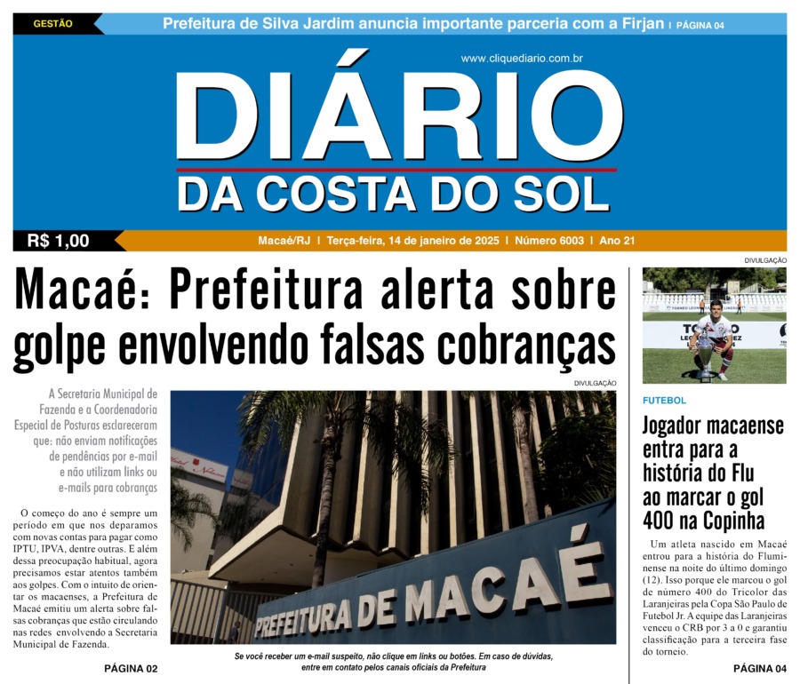 Edições Impressas Edição de terça-feira 14/01/2025 nº 6003 Publicado em 14/01/2025 - 08:02 Escrito por Redação Notícias relacionadas: Seguinte Edição de quarta-feira 15/01/2025 nº 6004 Anterior Edição de sábado a segunda-feira 11 a 13/01/2025 nº 6002 Redação Notícias Recentes Cabo Frio4 horas atrás Agentes de Cabo Frio recebem novo treinamento técnico para atuar em casos de poluição sonora Cabo Frio5 horas atrás Homem procurado por latrocínio é detido por agentes em Cabo Frio Cabo Frio5 horas atrás Representante da Guarda Civil de Cabo Frio compete na etapa final ao lado de jovens atletas Polícia5 horas atrás Prefeito de Rio das Ostras volta de Brasília com esperança de novos investimentos Cidades5 horas atrás Campos publica 8ª convocação e chama 374 professores substitutos para a rede municipal Esporte5 horas atrás De Saquarema para o Brasileirão: Vasco troca gramado de São Januário Cidades5 horas atrás Quissamã inicia planejamento educacional para 2026 com foco em Educação Financeira Polícia8 horas atrás Mulher é presa na RJ-106, em Saquarema, com R$ 38 mil em drogas e arma Saúde9 horas atrás Silva Jardim tem aulão em alusão à campanha mundial do Novembro Azul Mobilidade10 horas atrás Mobilidade promove fiscalização para verificar situação de táxis em Rio das Ostras Clique Diário E. L. Mídia Editora Ltda CNPJ: 09.298.880/0001-07 Redação: Rua Tupinambás 122 Gloria – Macaé/RJ comercial@diariocs.com (22) 2765-7353 (22) 999253130 Mais lidas da semana Cultura10 horas atrás Adilson Lopes apresenta exposição “Trajetória” em Casimiro de Abreu Cidades3 dias atrás Servidores de Rio das Ostras participam de treinamento do Estado em Búzios Polícia2 dias atrás Farmácia é interditada e uma pessoa é presa em Rio das Ostras em operação da Polícia Federal Cidades2 dias atrás Vereadores de Macaé vão embarcar nesta quinta para participar da COP 30 em Belém