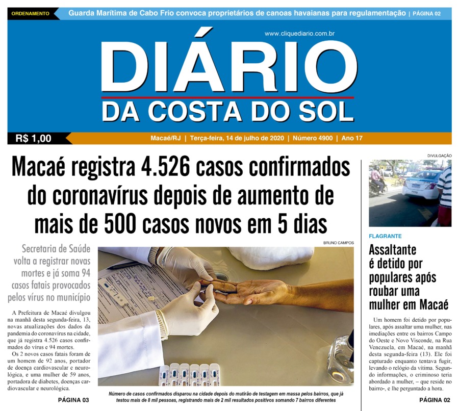 Edições Impressas Edição de terça-feira 14/07/2020 nº 4900 Publicado em 14/07/2020 - 05:00 Escrito por Fernando Vitor Notícias relacionadas:destaque Seguinte Edição de quarta-feira 15/07/2020 nº 4901 Anterior Edição de Sáb a Seg 11 a 13/07/2020 nº 4899 Fernando Vitor Notícias Recentes Cabo Frio18 horas atrás Arte e solidariedade marcam a 1ª Mostra de Dança Regional de Tamoios Cidades23 horas atrás Região serrana de Macaé recebe 1º X-Force Passeio de Quadriciclo e Aranha neste domingo (26) Polícia23 horas atrás Polícia apreende mais de meio quilo de drogas no Loteamento São João, em Rio das Ostras Saúde2 dias atrás Eventos esportivo e cultural reforça campanha do Outubro Rosa em Rio das Ostras nesse domingo, 26 Edições Impressas2 dias atrás Sábado a segunda-feira 25 a 27/10/2025 nº 6197 Cidades2 dias atrás Shopping Plaza Macaé oferece programação gratuita com feira de adoção e show de pagode neste fim de semana Cidades3 dias atrás 32º BPM completa 23 anos com solenidade de celebração e reconhecimento aos policiais Armação dos Búzios3 dias atrás Búzios celebra esporte e superação com XC RUN 2025 Araruama3 dias atrás Araruama promove saúde, lazer e cidadania em evento comunitário Arraial do cabo3 dias atrás Educação e sustentabilidade se encontram para jovens de Arraial do Cabo Clique Diário E. L. Mídia Editora Ltda CNPJ: 09.298.880/0001-07 Redação: Rua Tupinambás 122 Gloria – Macaé/RJ comercial@diariocs.com (22) 2765-7353 (22) 999253130 Mais lidas da semana Cultura7 dias atrás Silva Jardim anuncia shows gratuitos de samba e pagode para o fim de semana Cultura6 dias atrás Música, emoção e cores: Rodrigo Pontes apresenta show especial em Rio das Ostras Polícia7 dias atrás Policiais da PRF salvam bebê engasgado na BR-101, em Campos Cabo Frio7 dias atrás Atletas de várias cidades se enfrentam em competição de Muay Thai em Cabo Frio