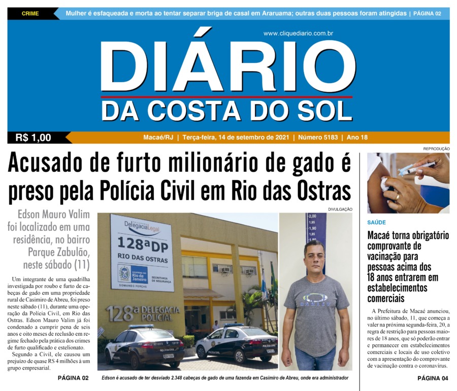 Edições Impressas Edição de terça-feira 14/09/2021 n° 5183 Publicado em 14/09/2021 - 00:07 Escrito por Fernando Vitor Notícias relacionadas: Seguinte Edição de quarta-feira 15/09/2021 n° 5184 Anterior Edição de Sábado a segunda-feira 11 a 13/09/2021 n° 5182 Fernando Vitor Notícias Recentes Armação dos Búzios15 minutos atrás Búzios atinge 80% de ocupação no feriado Cabo Frio1 hora atrás Cabo Frio prepara esquema especial de segurança nas praias e áreas de lazer Cabo Frio1 hora atrás Cabo Frio realiza ações de proteção a fauna após aparecimento de animais em bairros Cabo Frio1 hora atrás Cabo Frio reúne especialistas em evento do programa “Vim Cuidar de Você” Desenvolvimento1 hora atrás Rio das Ostras estreita relações com a Rede Petro BC de olho em eventos do setor de energia em 2026 Cabo Frio1 hora atrás Aula-passeio apresenta riqueza cultural e ambiental de Cabo Frio na Fazenda Campos Novos Cabo Frio1 hora atrás Cabo Frio suspende expediente em órgãos públicos nesta sexta Cidades1 hora atrás Macaé terá Dia do Futebol Feminino e programa para valorização da mulher rural Arraial do cabo1 hora atrás Carreta científica desembarca em Arraial do Cabo com programação gratuita Polícia2 horas atrás Polícia Civil prende liderança do ADA no bairro Fronteira em Macaé Clique Diário E. L. Mídia Editora Ltda CNPJ: 09.298.880/0001-07 Redação: Rua Tupinambás 122 Gloria – Macaé/RJ comercial@diariocs.com (22) 2765-7353 (22) 999253130 Mais lidas da semana Cultura5 dias atrás Adilson Lopes apresenta exposição “Trajetória” em Casimiro de Abreu Esporte5 dias atrás De Saquarema para o Brasileirão: Vasco troca gramado de São Januário Cidades6 dias atrás Macaé é finalista no Festival Internacional de Cinema Cristão com “A Paixão de Cristo” Mobilidade5 dias atrás Mobilidade promove fiscalização para verificar situação de táxis em Rio das Ostras