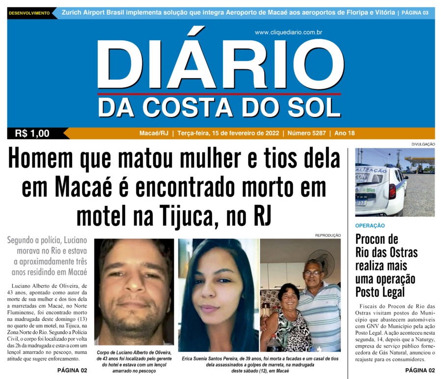 Edições Impressas Edição de terça-feira 15/02/2022 nº 5287 Publicado em 14/02/2022 - 23:56 Escrito por Fernando Vitor Notícias relacionadas: Seguinte Edição de quarta-feira, 16/02/2022 nº 5288 Anterior Edição de sábado a segunda-feira 12 a 14/02/2022 nº 5286 Fernando Vitor Notícias Recentes Desenvolvimento47 minutos atrás Maricá assina acordo para receber curso da UFRJ a partir do próximo vestibular Meio Ambiente1 hora atrás Servidores de limpeza das praias de Saquarema visitam o AquaRio, no Rio Esporte2 horas atrás Corrida Dignus Run tem 3ª edição nesse domingo, 9, em Rio das Ostras Cidades3 horas atrás Qualificação da mão de obra impulsiona a economia de Macaé Cidades3 horas atrás Macaé vai receber amistoso em homenagem às vítimas da Chapecoense no Moacyrzão Polícia3 horas atrás Integração e inteligência: 32º BPM alcança bons resultados na segurança pública Edições Impressas5 horas atrás Edição de sexta-feira 07/11/2025 nº 6207 São Pedro da Aldeia21 horas atrás Feirão de Empregabilidade promete movimentar a Praça das Águas em São Pedro da Aldeia Diversão21 horas atrás Praia do Abricó, em Rio das Ostras, sedia evento fitness nesse fim de semana Arraial do cabo21 horas atrás Feira de Ciências e Tecnologia em Arraial tem visita ilustre dos cães da Segurança Pública Clique Diário E. L. Mídia Editora Ltda CNPJ: 09.298.880/0001-07 Redação: Rua Tupinambás 122 Gloria – Macaé/RJ comercial@diariocs.com (22) 2765-7353 (22) 999253130 Mais lidas da semana Arraial do cabo1 dia atrás Arraial do Cabo celebra 3ª edição do Festival de Frutos do Mar com entrada livre; Carol Biazin, Ramona Rox, Liah Soares e mais Meio Ambiente22 horas atrás Ações do Programa Limpa Rio seguem em vários pontos de Rio das Ostras Polícia4 dias atrás Homem é preso em Maricá depois de matar uma pessoa a facadas nessa madrugada Cidades3 dias atrás HFM ganha novo Pronto-Socorro moderno e ampliado em Campos