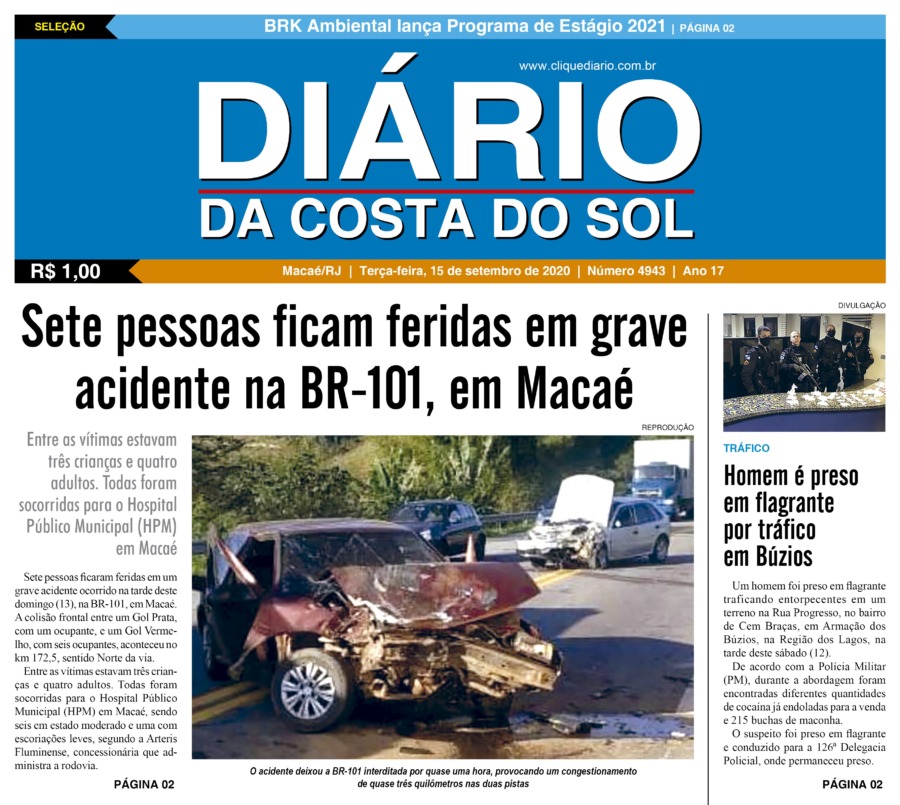 Edições Impressas Edição de terça-feira 15/09/2020 nº 4943 Publicado em 15/09/2020 - 05:00 Escrito por Fernando Vitor Notícias relacionadas:destaque Seguinte Edição de quarta-feira 16/09/2020 nº 4944 Anterior Edição de sábado a segunda-feira 12 a 14/09/2020 nº 4942 Fernando Vitor Notícias Recentes Cabo Frio7 horas atrás Arte e solidariedade marcam a 1ª Mostra de Dança Regional de Tamoios Cidades12 horas atrás Região serrana de Macaé recebe 1º X-Force Passeio de Quadriciclo e Aranha neste domingo (26) Polícia12 horas atrás Polícia apreende mais de meio quilo de drogas no Loteamento São João, em Rio das Ostras Saúde1 dia atrás Eventos esportivo e cultural reforça campanha do Outubro Rosa em Rio das Ostras nesse domingo, 26 Edições Impressas1 dia atrás Sábado a segunda-feira 25 a 27/10/2025 nº 6197 Cidades2 dias atrás Shopping Plaza Macaé oferece programação gratuita com feira de adoção e show de pagode neste fim de semana Cidades2 dias atrás 32º BPM completa 23 anos com solenidade de celebração e reconhecimento aos policiais Armação dos Búzios2 dias atrás Búzios celebra esporte e superação com XC RUN 2025 Araruama2 dias atrás Araruama promove saúde, lazer e cidadania em evento comunitário Arraial do cabo2 dias atrás Educação e sustentabilidade se encontram para jovens de Arraial do Cabo Clique Diário E. L. Mídia Editora Ltda CNPJ: 09.298.880/0001-07 Redação: Rua Tupinambás 122 Gloria – Macaé/RJ comercial@diariocs.com (22) 2765-7353 (22) 999253130 Mais lidas da semana Cultura6 dias atrás Silva Jardim anuncia shows gratuitos de samba e pagode para o fim de semana Cultura5 dias atrás Música, emoção e cores: Rodrigo Pontes apresenta show especial em Rio das Ostras Cabo Frio6 dias atrás Atletas de várias cidades se enfrentam em competição de Muay Thai em Cabo Frio Cabo Frio6 dias atrás Serviços essenciais permanecem ativos durante ponto facultativo em Cabo Frio