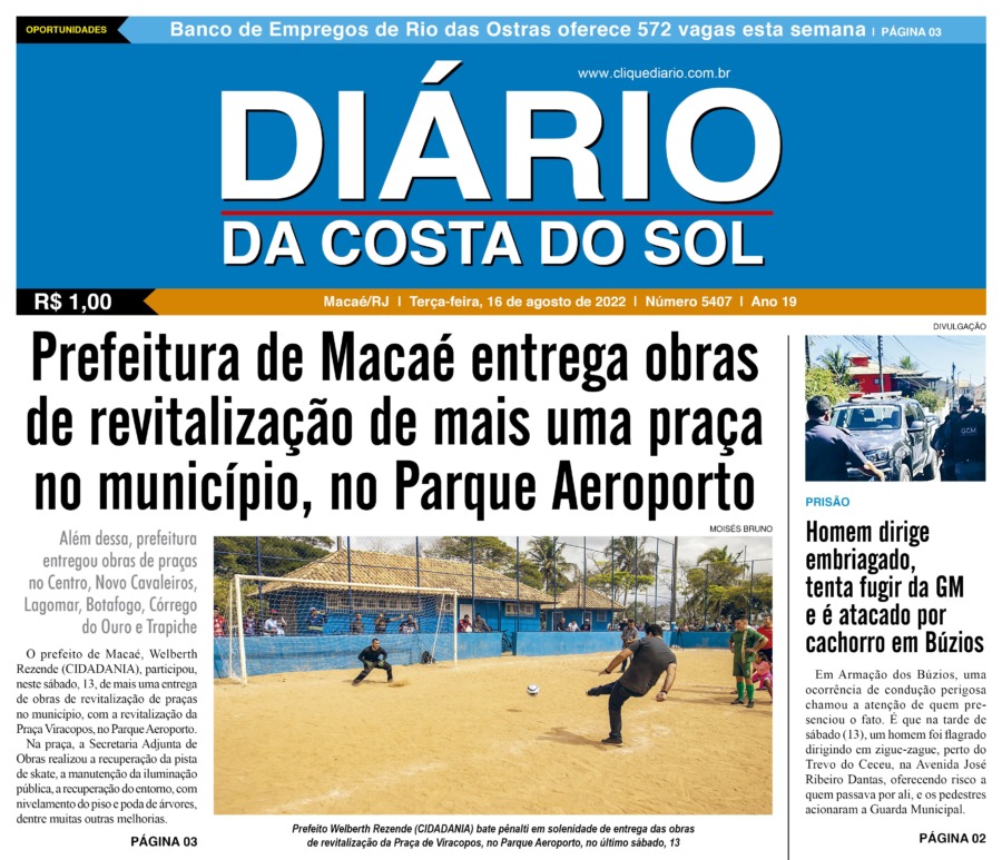 Edições Impressas Edição de terça-feira 16/08/2022 nº 5407 Publicado em 15/08/2022 - 23:55 Escrito por Fernando Vitor Notícias relacionadas: Seguinte Edição de quarta-feira 17/08/2022 nº 5408 Anterior Edição de sábado a segunda-feira 13 a 15/08/2022 nº 5406 Fernando Vitor Notícias Recentes Cidadania17 minutos atrás Distrito de Casimiro de Abreu recebe Programa RJ para Todos, do governo estadual Cultura3 horas atrás Moda e Prosa Caipira tem sua 6ª edição nessa quinta, 20, em Saquarema Comércio4 horas atrás Rio das Ostras tem 19ª edição de sua tradicional feira outlet nesse feriado Cidades4 horas atrás Macaé recebe 20ª edição do Prefeitura Presente no dia 25 de novembro Polícia5 horas atrás Denúncia anônima leva à prisão de duas mulheres por tráfico em Macaé Cidades5 horas atrás Caravana de Natal Coca-Cola passa por Rio das Ostras e Casimiro de Abreu nessa quinta, 20 Edições Impressas6 horas atrás Edição de quarta-feira 19/11/2025 nº 6215 Arraial do cabo22 horas atrás Educação de Arraial do Cabo orienta responsáveis sobre rematrícula para o próximo ano Cabo Frio22 horas atrás Evento comercial mais aguardado de Cabo Frio atinge 100% de estandes vendidos Saúde23 horas atrás Rio das Ostras comemora melhorias no atendimento da saúde municipal Clique Diário E. L. Mídia Editora Ltda CNPJ: 09.298.880/0001-07 Redação: Rua Tupinambás 122 Gloria – Macaé/RJ comercial@diariocs.com (22) 2765-7353 (22) 999253130 Mais lidas da semana Cultura5 dias atrás Adilson Lopes apresenta exposição “Trajetória” em Casimiro de Abreu Cidades7 dias atrás Parceria com o Estado reforça prevenção de enchentes em Rio das Ostras há 39 dias do verão Meio Ambiente2 dias atrás Lagoa de Iriry, em Rio das Ostras, recebe nova sinalização focada em sustentabilidade Cidades2 dias atrás Macaé registra avanço na coleta seletiva porta a porta e recolhe mais de 2 toneladas em 45 dias